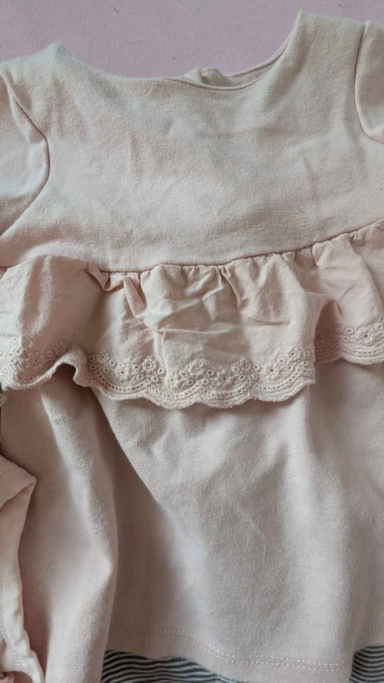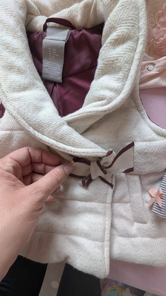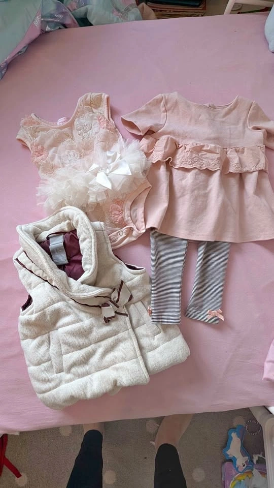 Adorable baby girl clothes bundle. Includes a super cute POPATO pink floral romper with tulle and a white bow. Also a pink ruffled top, striped leggings with little pink bows, and a cream quilted vest. All in great shape. Pickup only at St Clair Ave East and O'Connor.