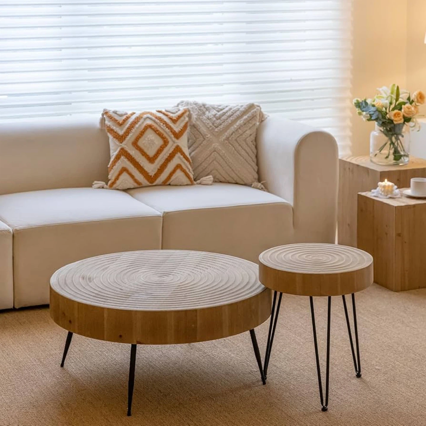 Set of two wood slice tables with black metal hairpin legs. Features a unique textured wood grain surface. Great for living rooms or as accent pieces!