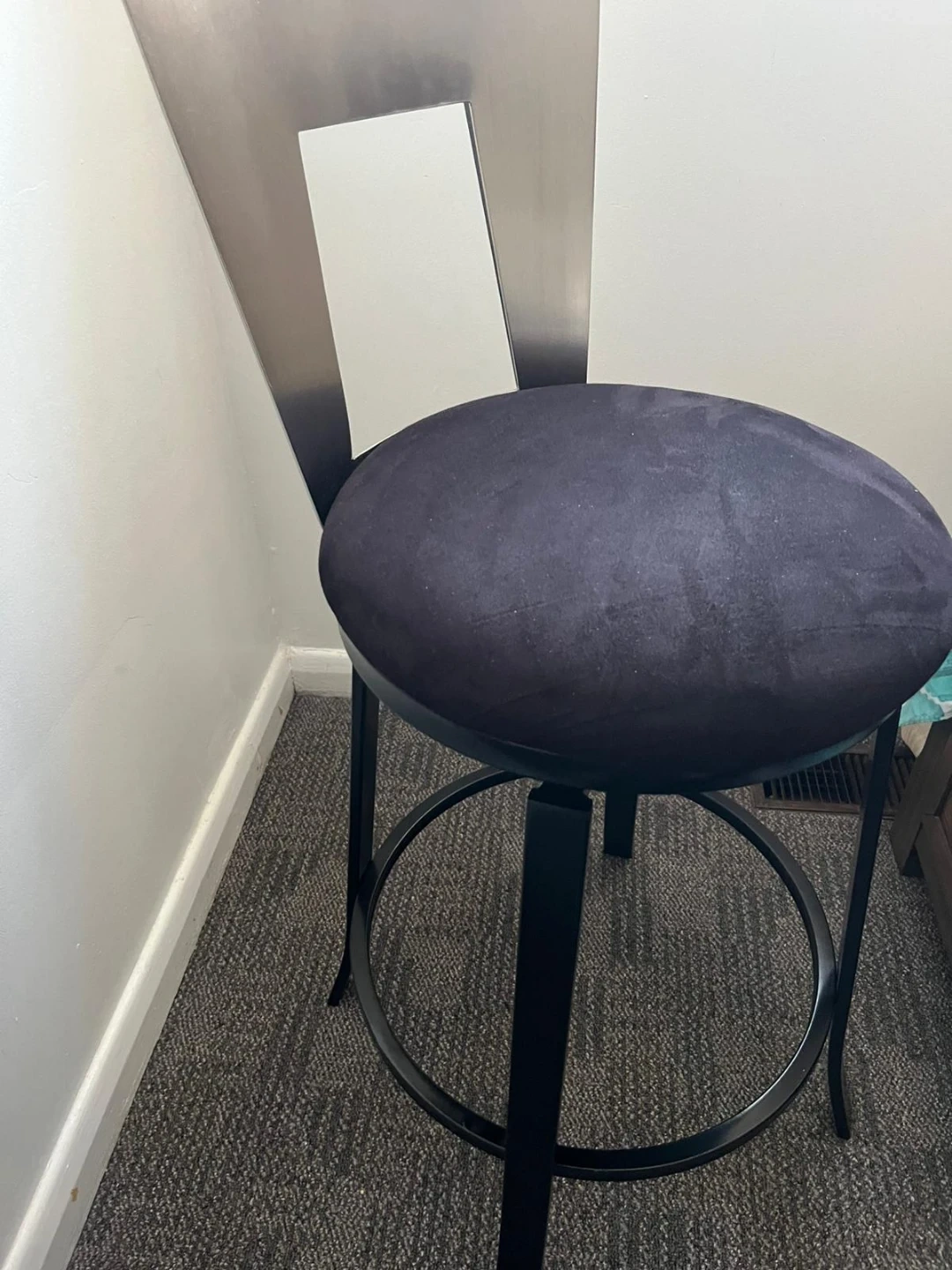 This bar stool features a comfortable black velvet seat with a supportive backrest. Its height is adjustable and it swivels 360 degrees. The sturdy metal base ensures stability.3 pieces available