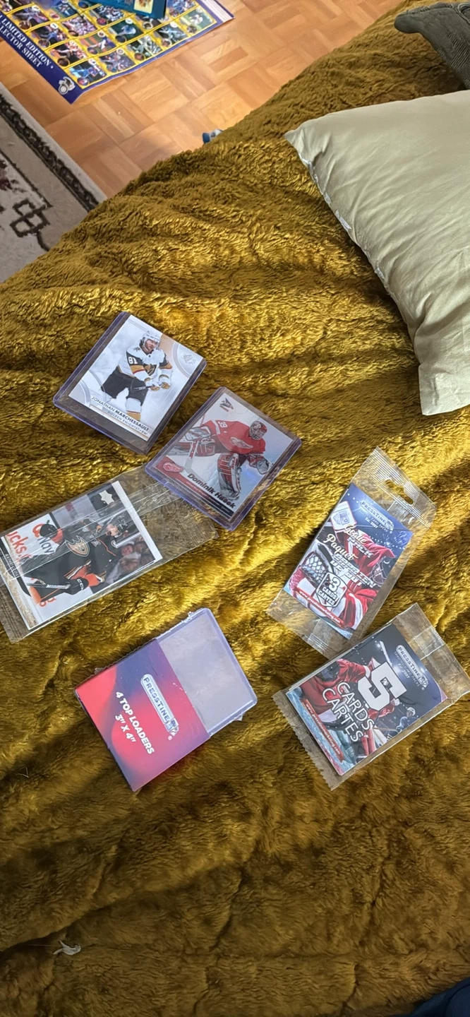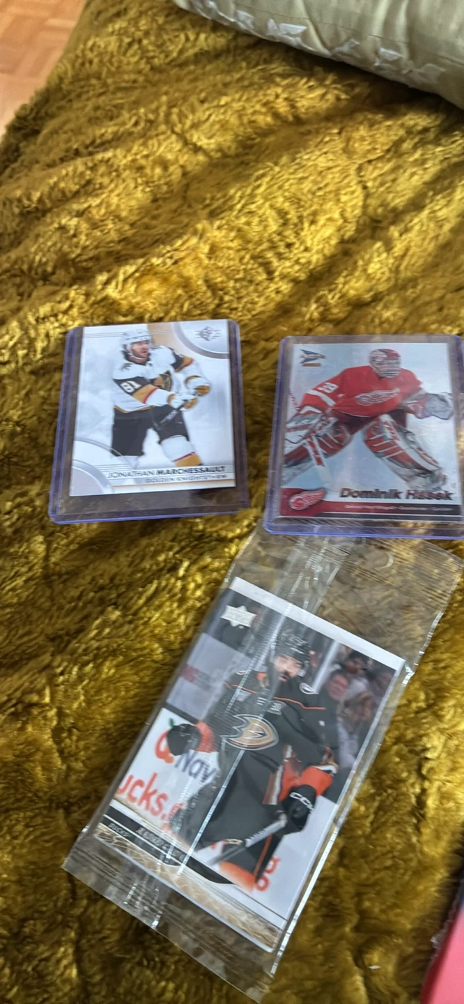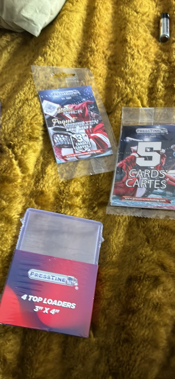 Presstine 4 Top Loaders 3" X 4". Includes 2 packs of hockey cards, one with 5 cards and another with 3 cards. Also comes with two individual hockey cards featuring Jonathan Marchessault and Dominik Hasek.