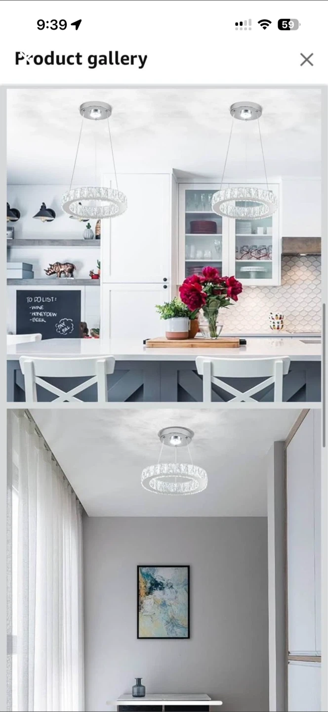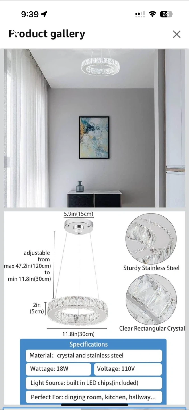 This modern pendant light features a stylish ring design with clear rectangular crystals. It's made from durable stainless steel and has a built-in LED light source. The adjustable cord allows for hanging heights from 11.8 inches to 47.2 inches. It's perfect for a dining room, kitchen, or hallway!