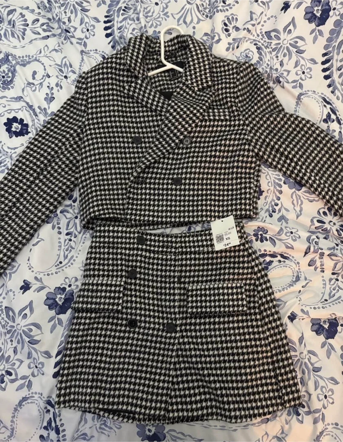 Selling a cute Forever 21 skirt set! It features a classic houndstooth pattern in black and white. The set includes a cropped blazer and a matching skirt. The size is XS. Originally bought for $24.99 USD for the skirt ans 30 USD for Blazer