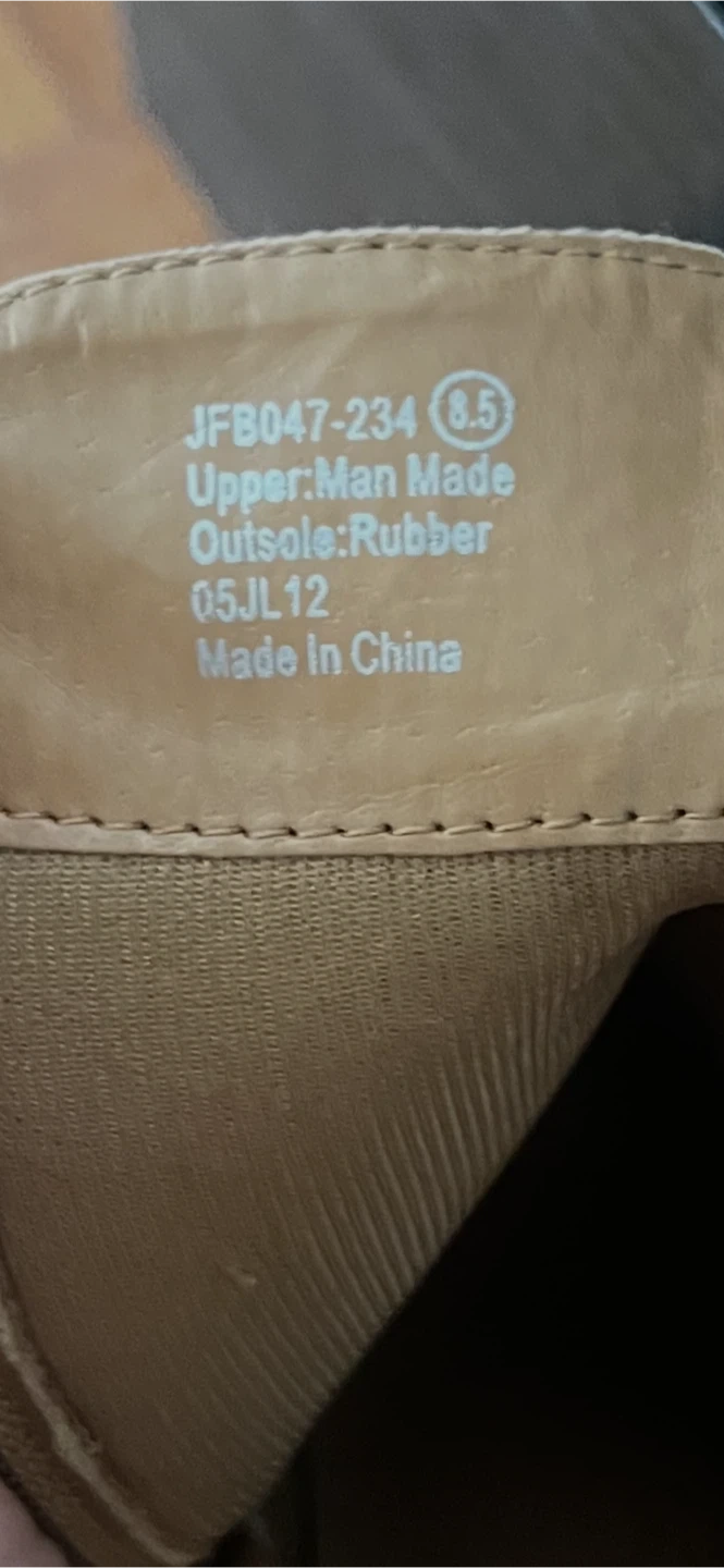 Tan ankle boots with a side zipper and a stylish wedge heel. Upper is man-made material, and the outsole is rubber. These boots are size 8.5. They're great for dressing up an outfit!