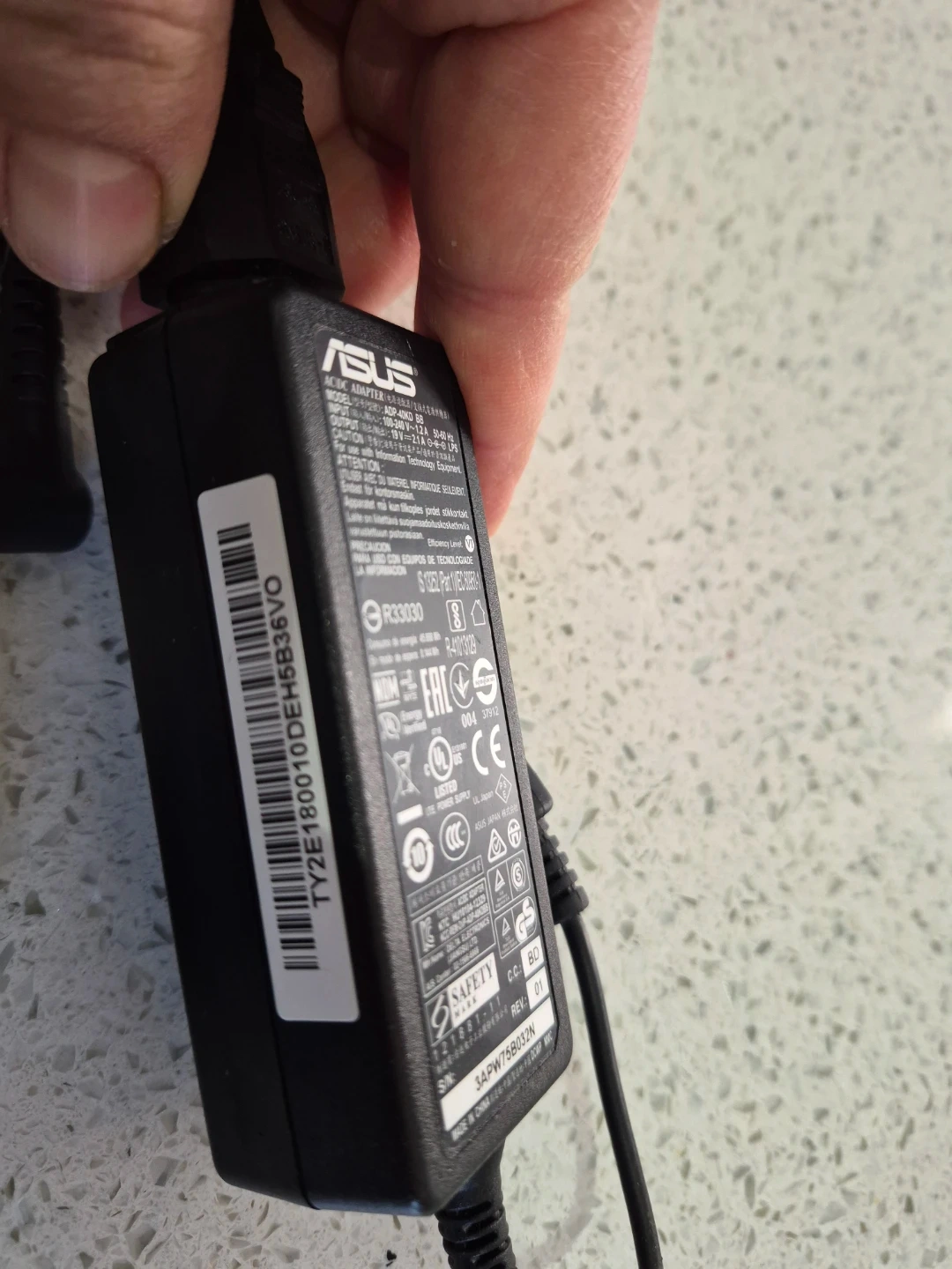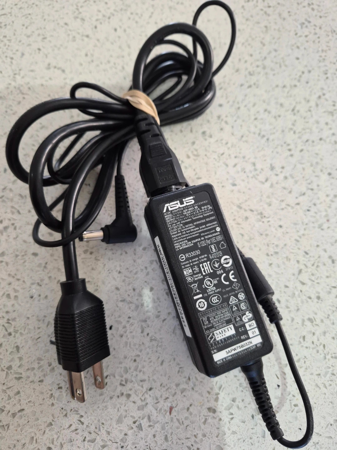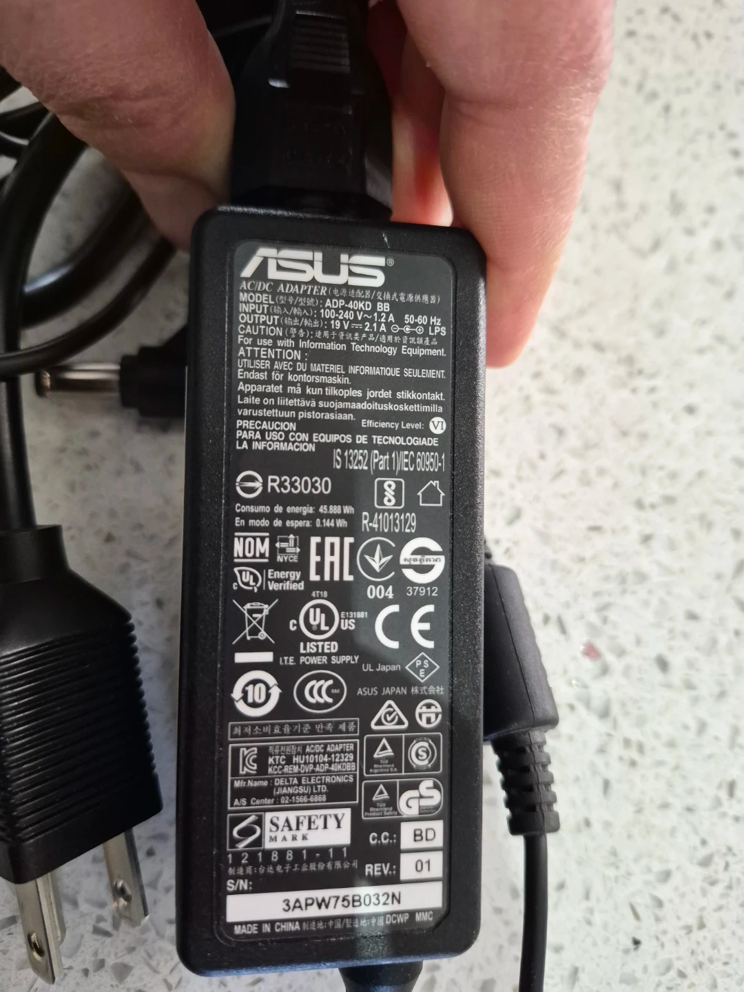 This is an ASUS ADP-40KH AC/DC adapter. It's a replacement power supply for laptops. Works with input voltage 100-240V, 50-60Hz, and output 19V, 2.1A. It's made in China.