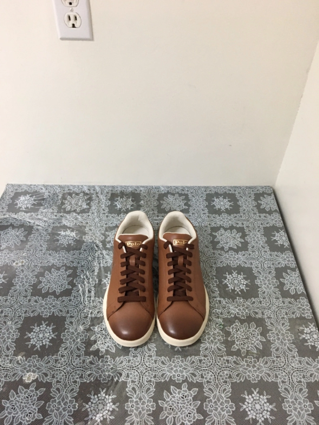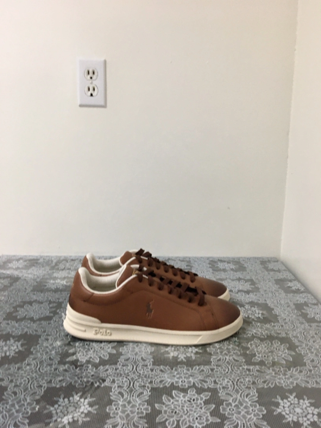 Stylish brown leather sneakers from Ralph Lauren Polo. Features a classic lace-up design and comfortable rubber sole. These shoes are perfect for everyday wear. Pick up at steeles and Bathurst cash only