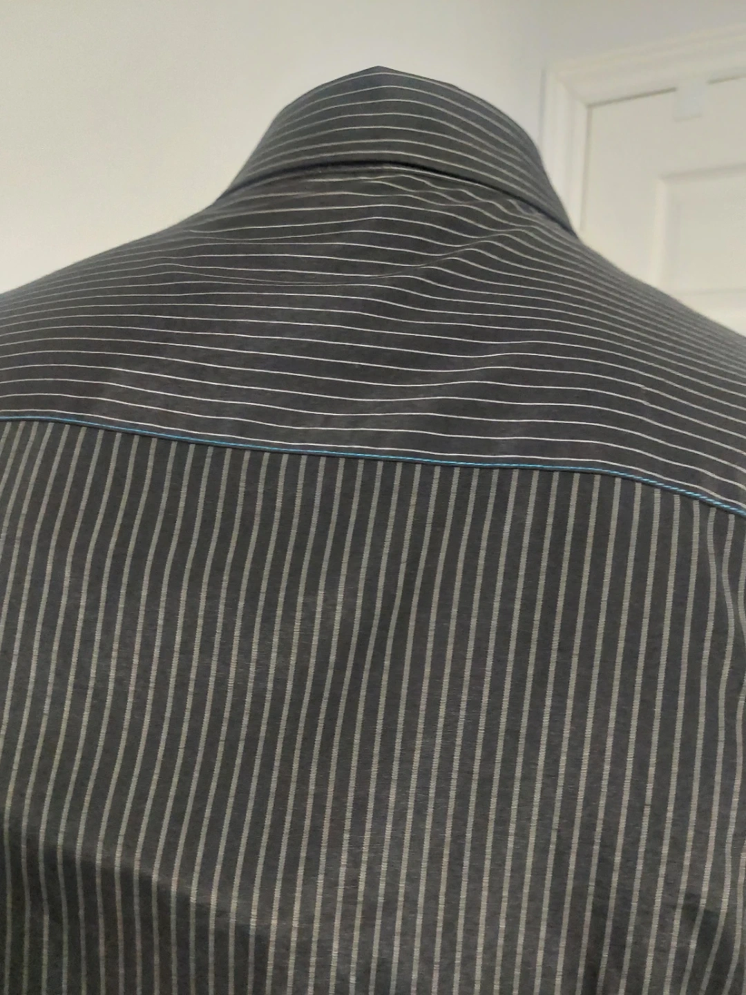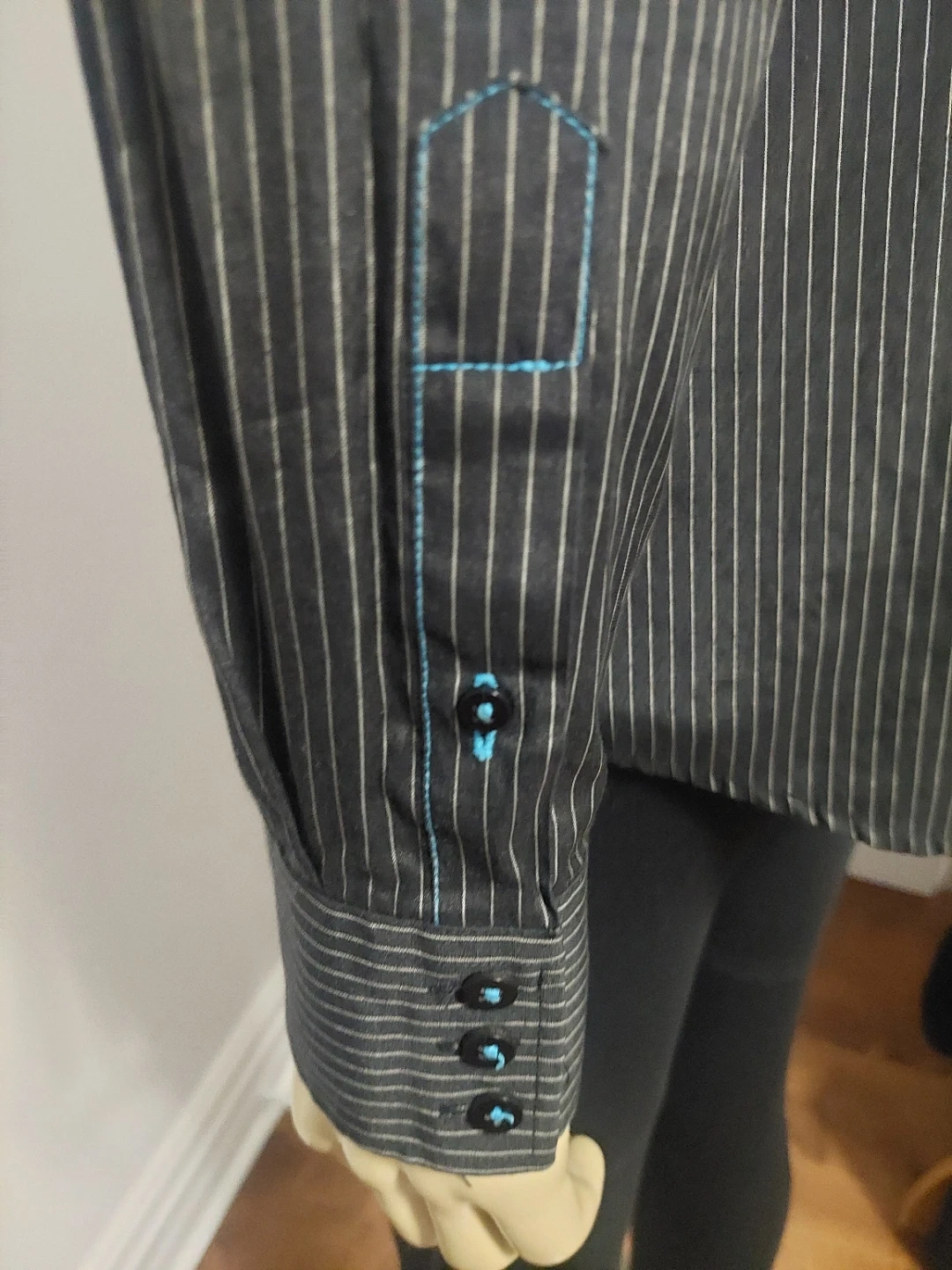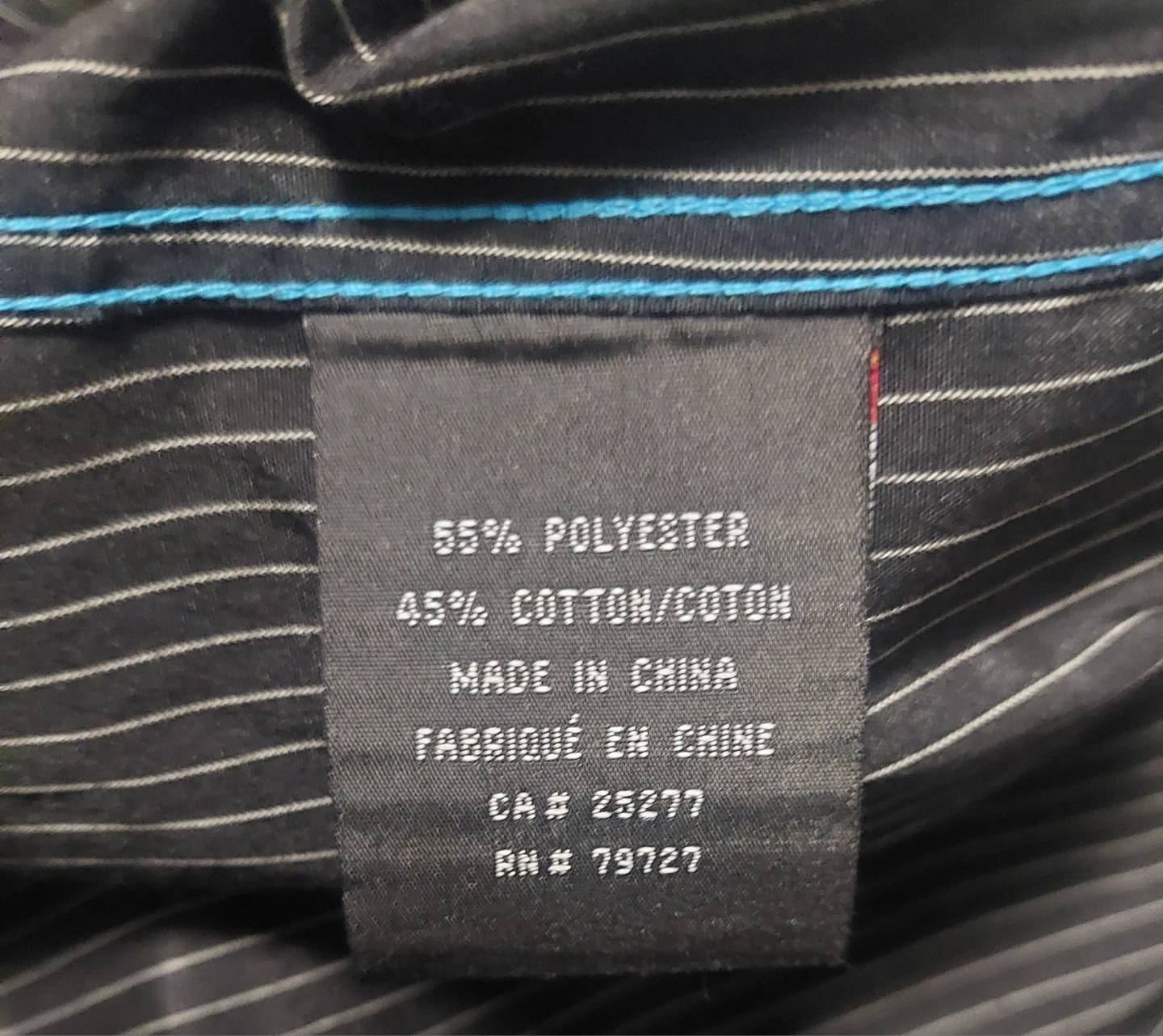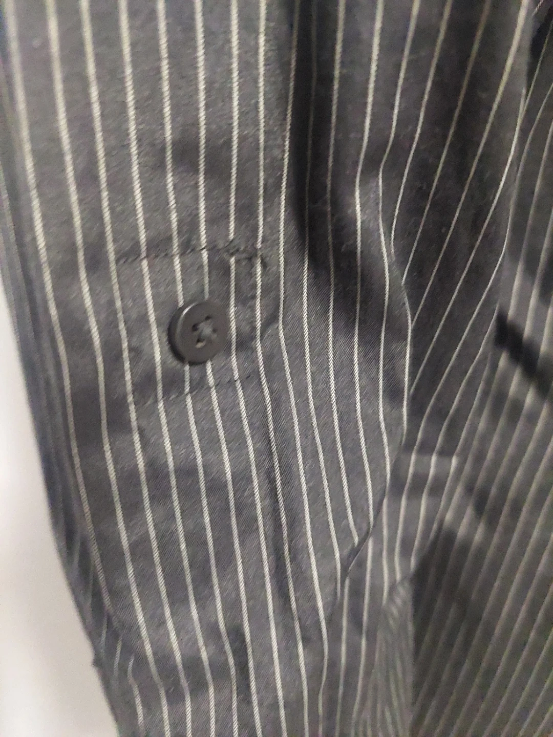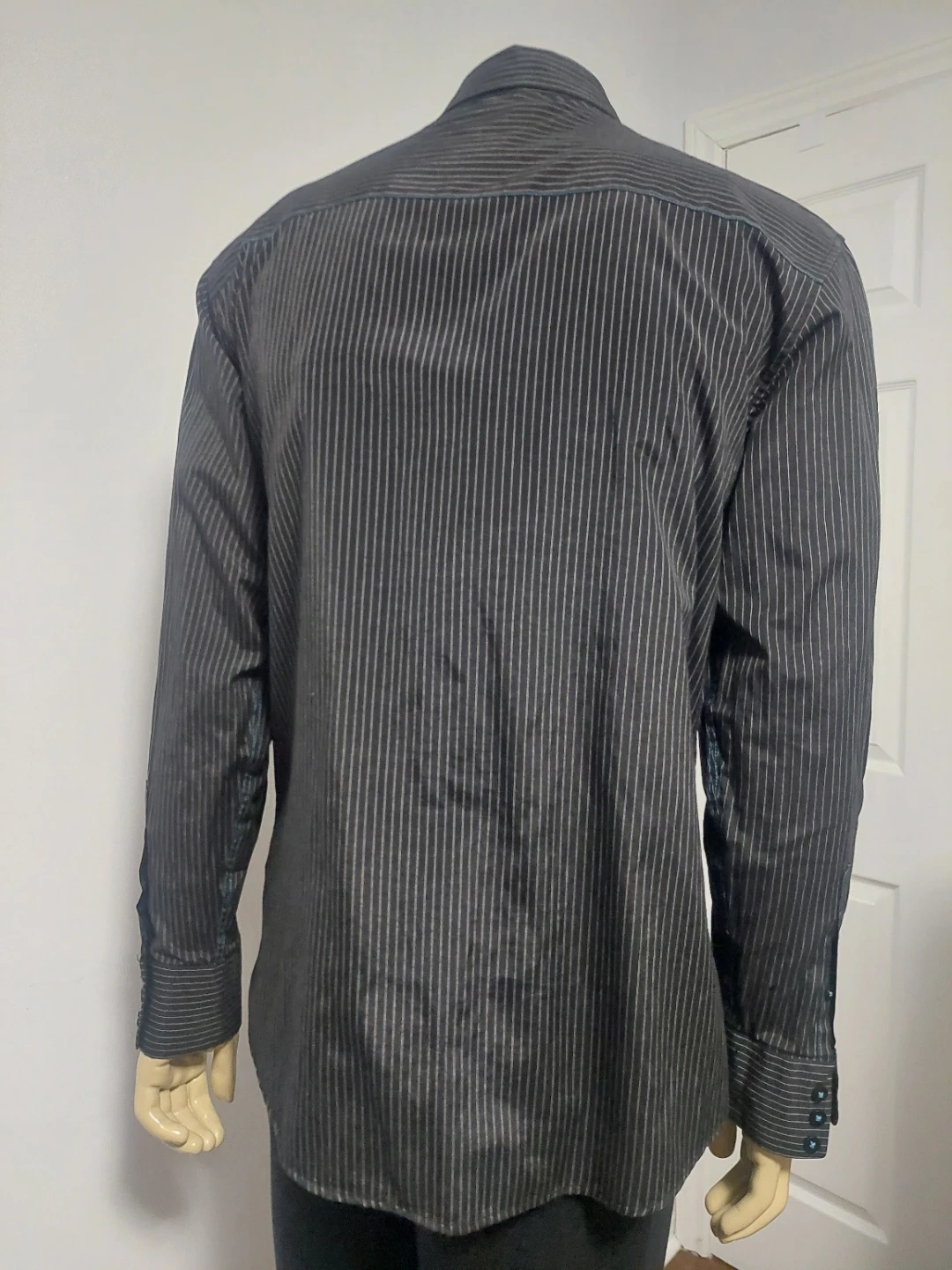 Classic charcoal grey dress shirt with a subtle pinstripe pattern. It's made from a blend of 55% polyester and 45% cotton for comfort. This shirt is great for business casual or formal occasions.