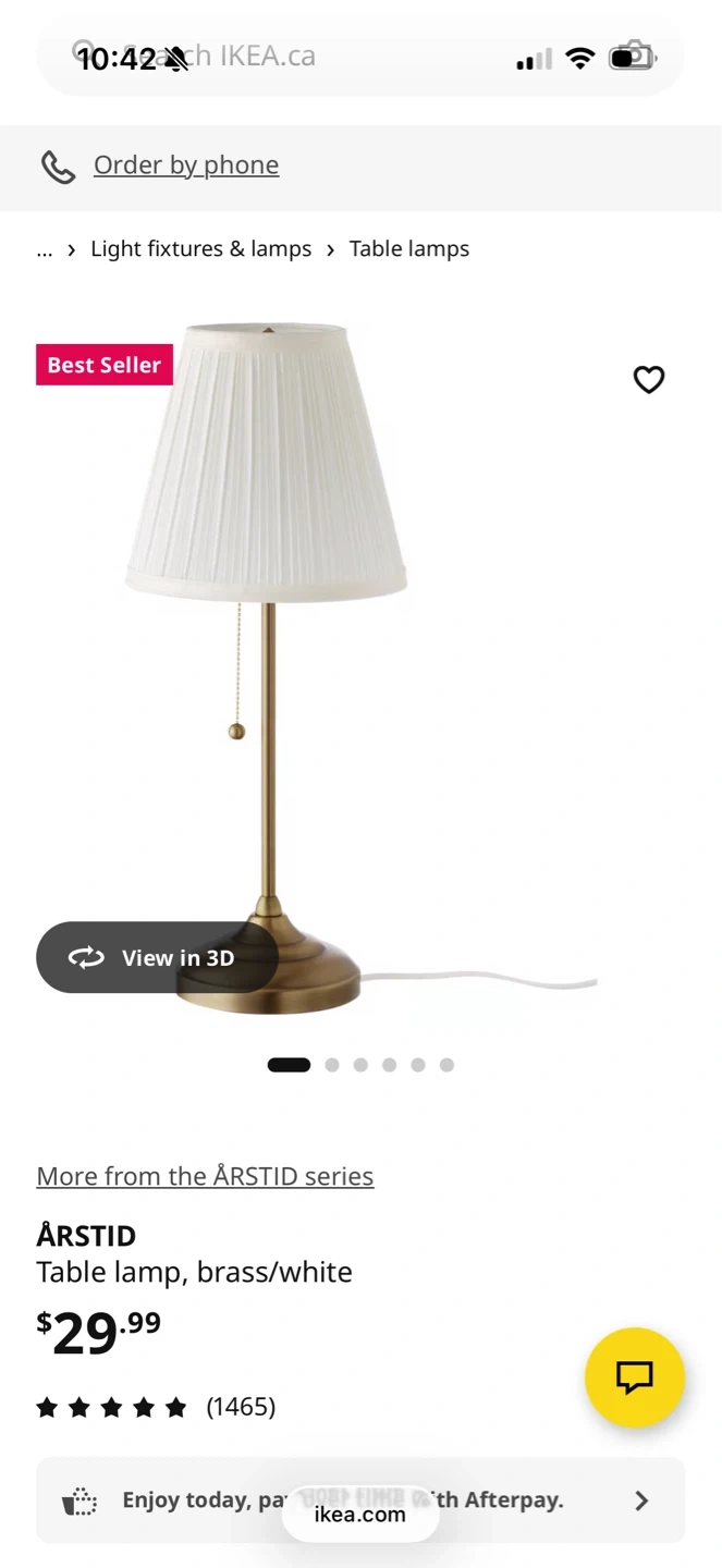 Selling two IKEA ÅRSTID table lamps in brass and white. These lamps have a classic pleated shade and a pull-chain switch. They're a great size for bedside tables or desks. Come with cords and plugs.