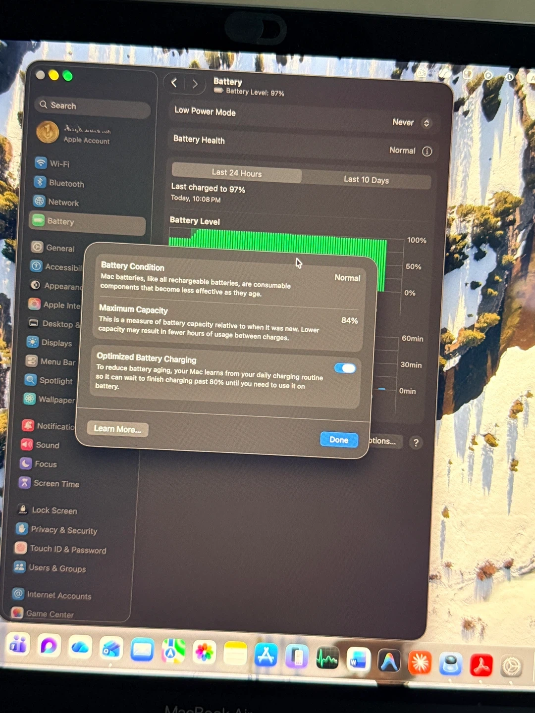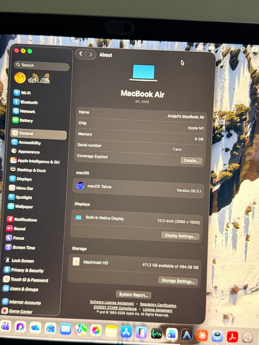 MacBook Air M1, 2020 model with 8 GB RAM and 500 GB storage. It has a 13.3-inch Retina display. Battery condition is normal with 84% maximum capacity.
