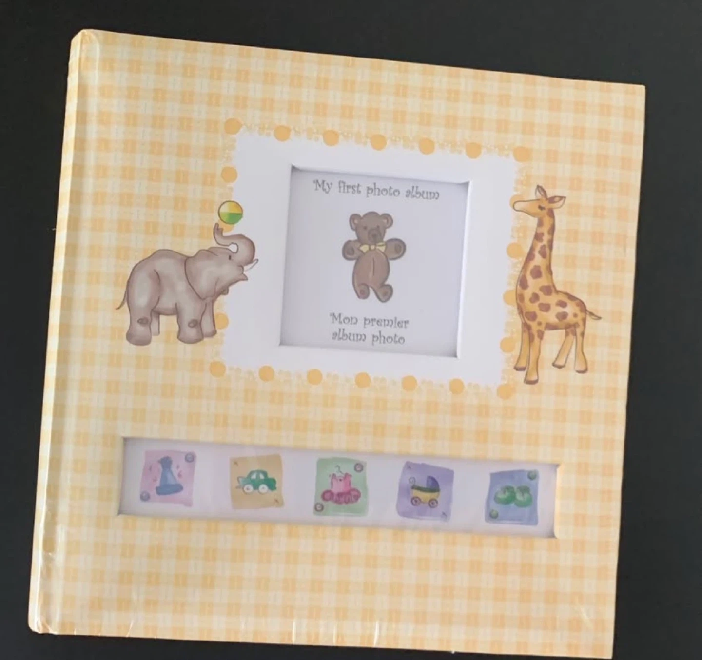 This is a "My first photo album" for a baby. It has a yellow gingham pattern with cute animal illustrations. It's perfect for storing your little one's precious memories!