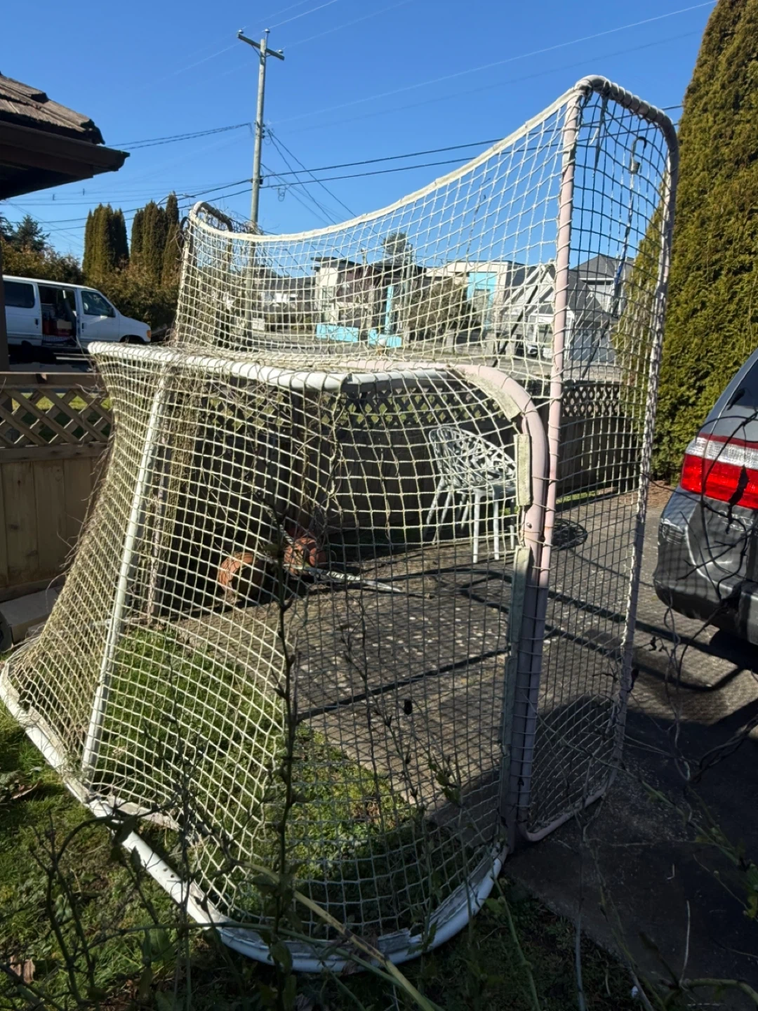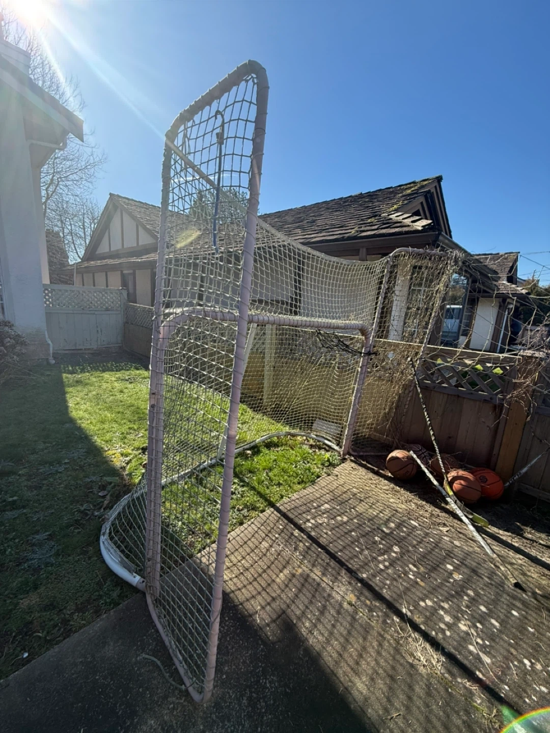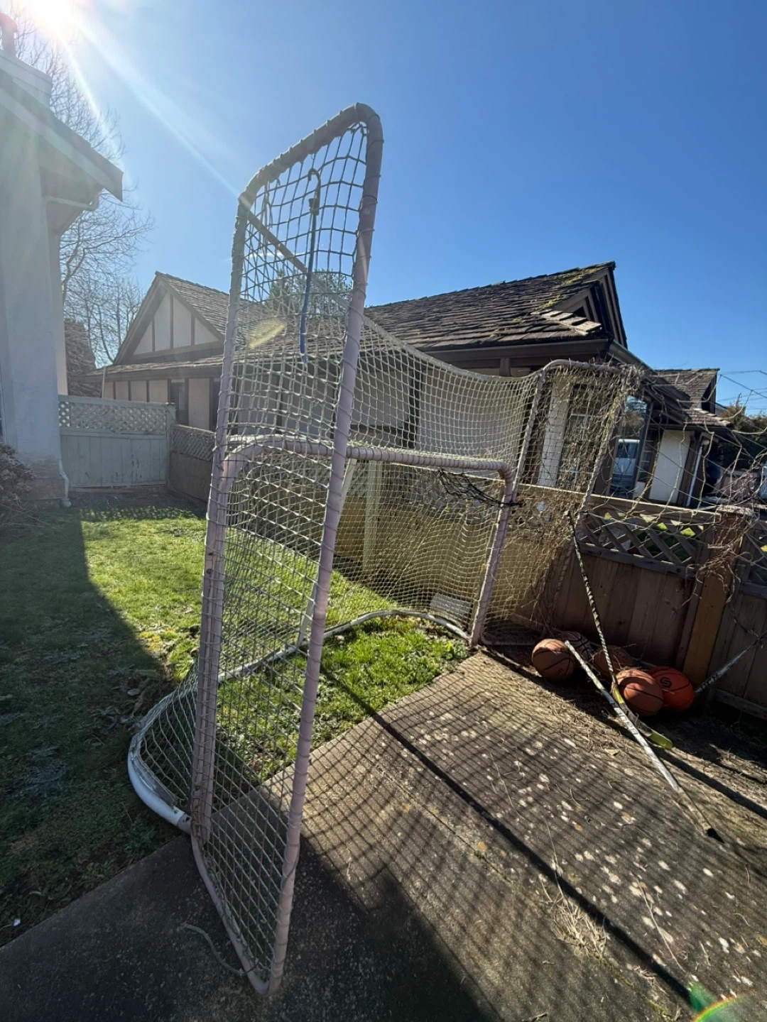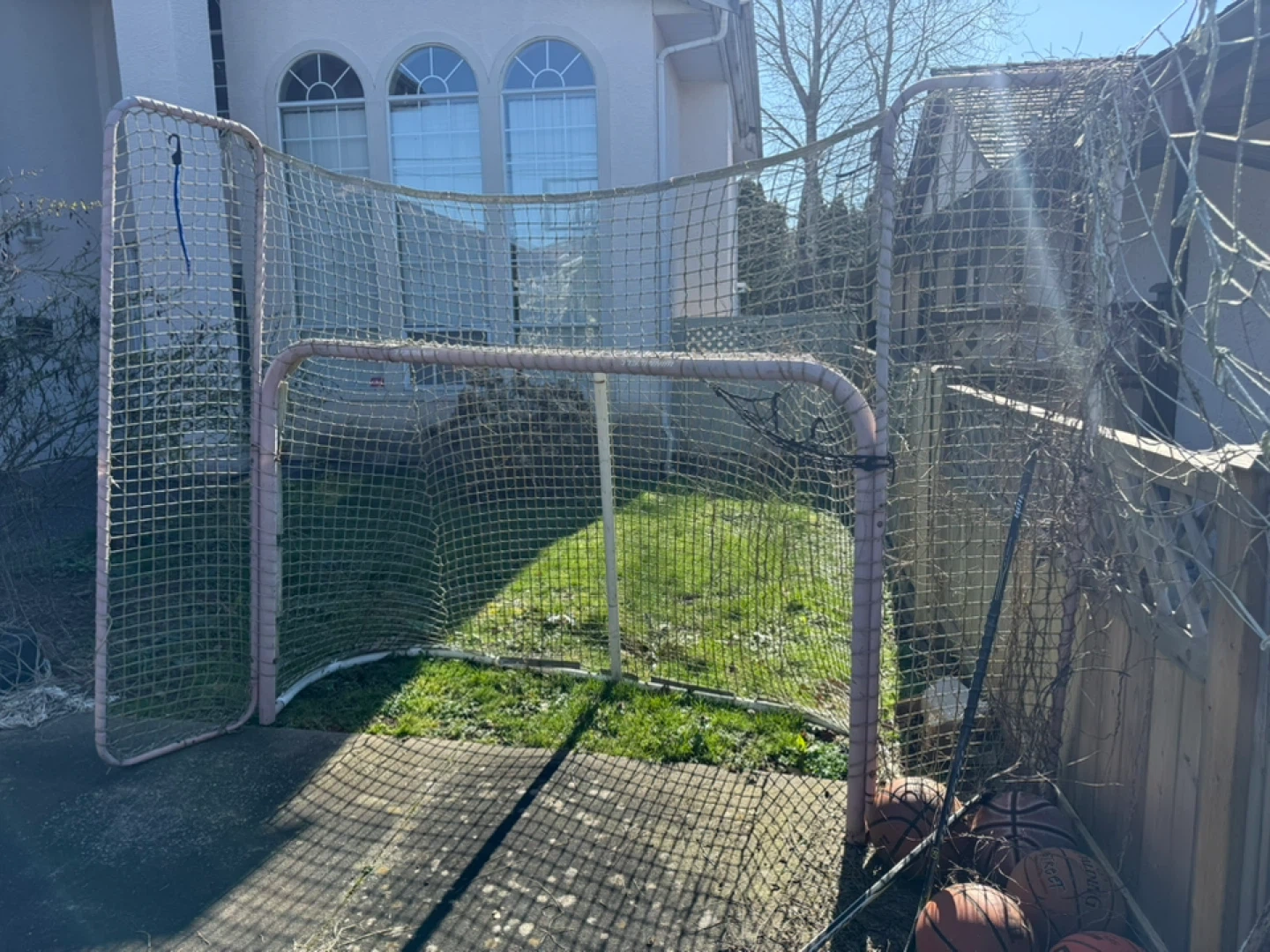 A sturdy goal net suitable for hockey or lacrosse practice. It's made with a metal frame and a durable net. The net shows some signs of wear but is still fully functional for backyard games or training. Great for getting active outside!