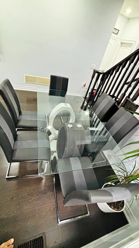 We recently bought this dining set, including a table and 6 chairs, from the Brick store. It's brand new, open box. As we are moving out, we are selling this new dining set for as low a price as I can. Feel free to message if you have any questions!