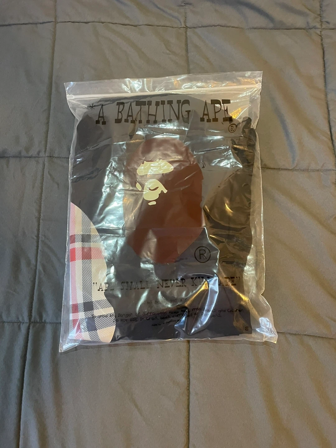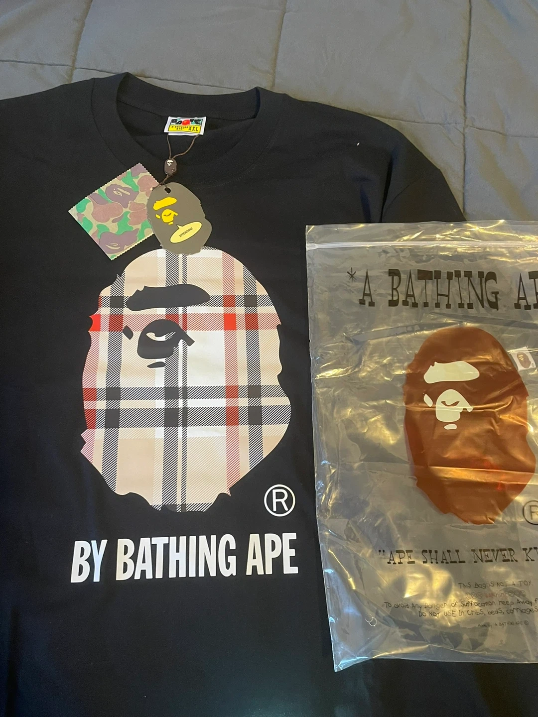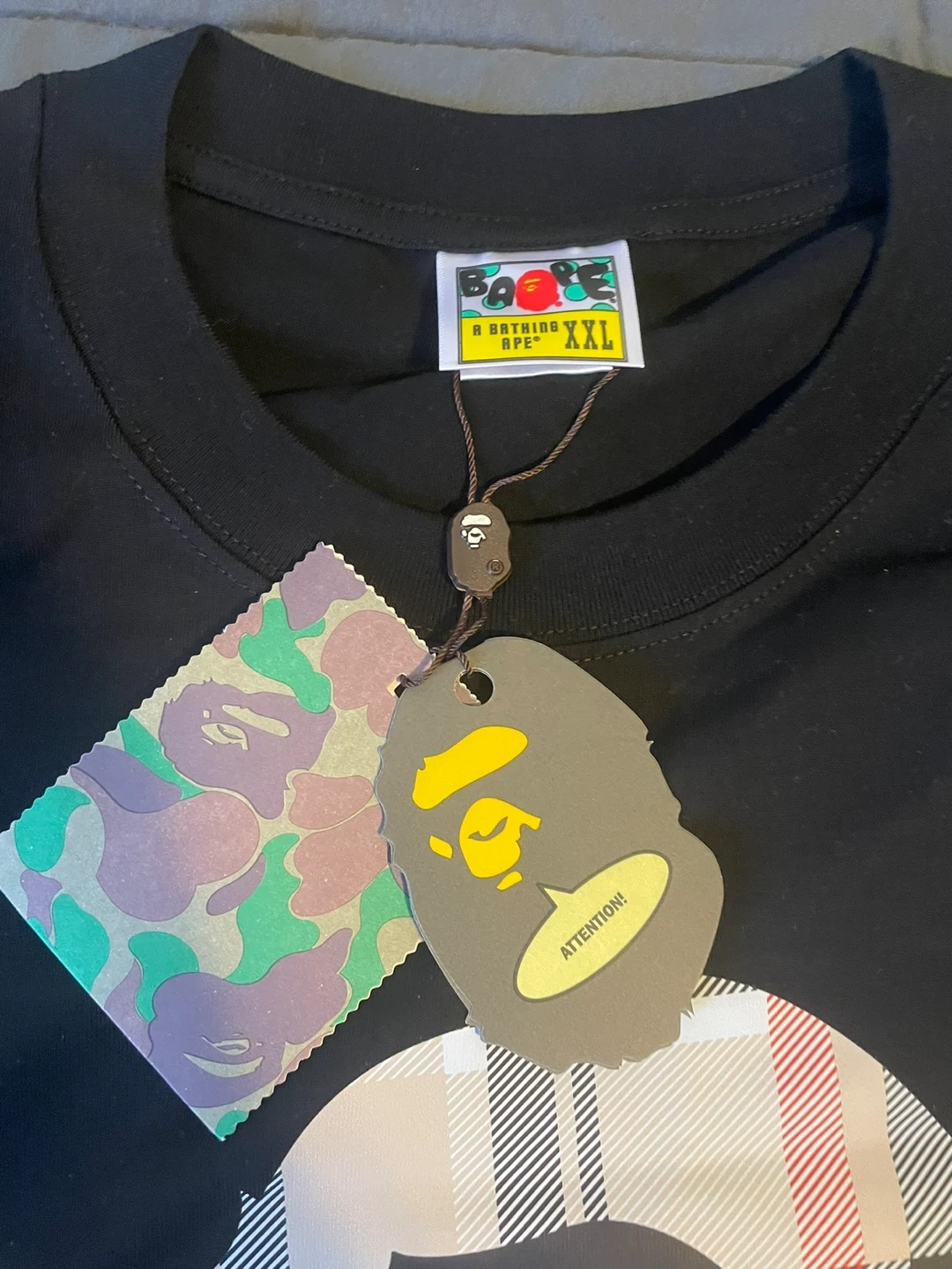 Black t-shirt by A Bathing Ape. Features the iconic ape head graphic with a plaid fill. Includes original tags and packaging. Size is XXL.