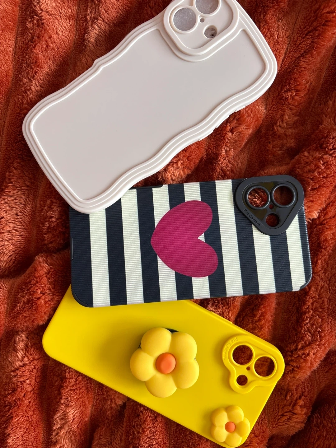 This lot includes three phone cases. One is a light pink with a wavy edge. Another features black and white stripes with a pink heart design. The third is yellow with cute flower embellishments. These cases offer a pop of style for your phone!