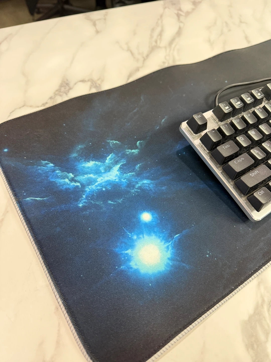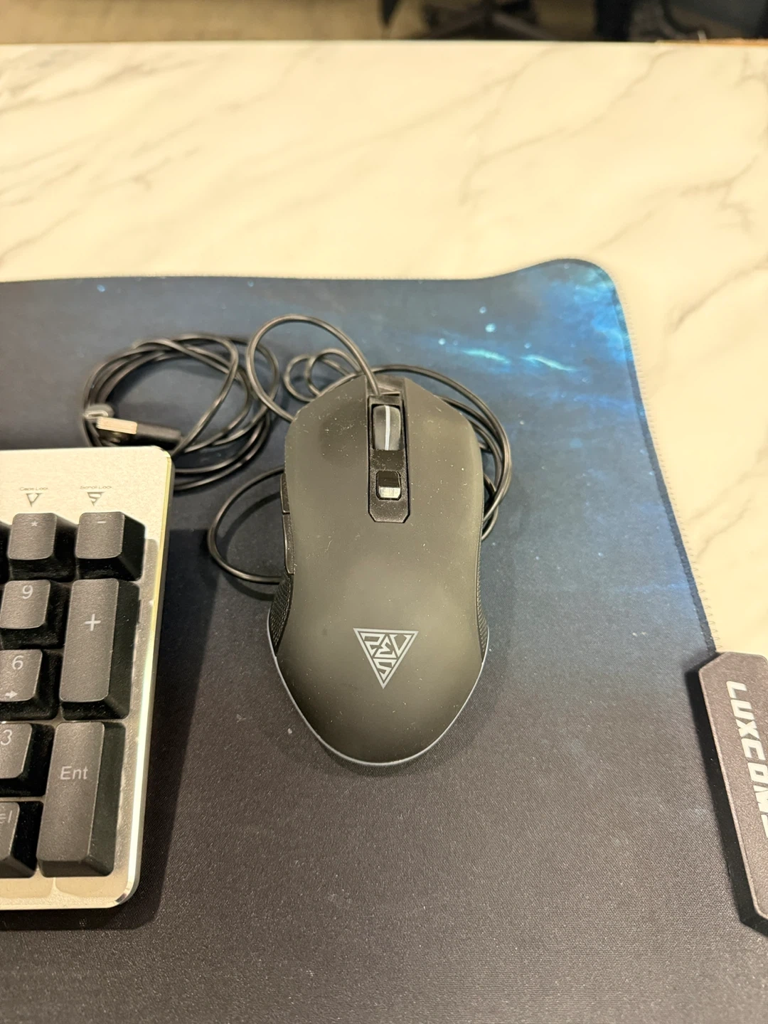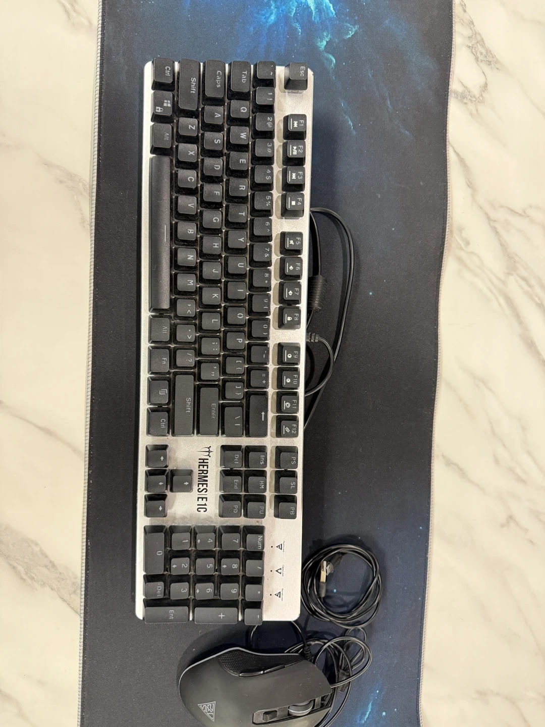 This is a Thermaltake Poseidon Z keyboard and mouse combo. The keyboard features mechanical switches and RGB backlighting. It's a great setup for gaming or everyday use! The included mouse is also designed for gaming.
