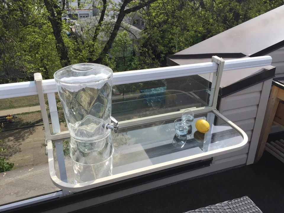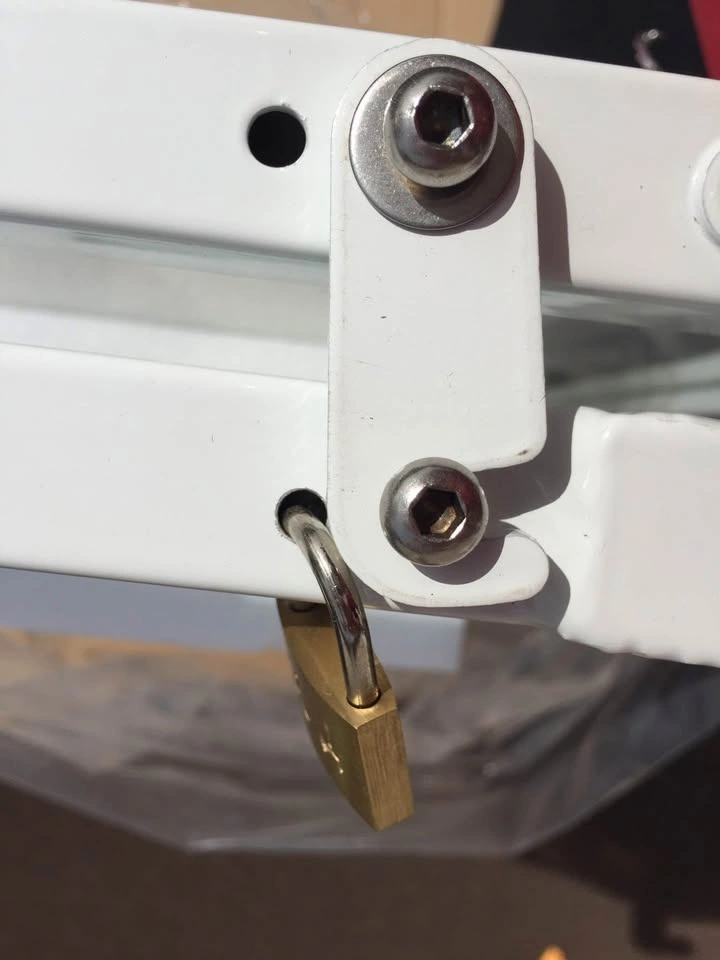 Fits any 1 to 4 inch railing securely. Made from high test Aluminum and think tempered glass. Holds up to 200 lbs of weight for your heavy plants and also locks up with a key for child safety. Comes in Tan color and limited quantities left so get yours now! Brand new in a box!