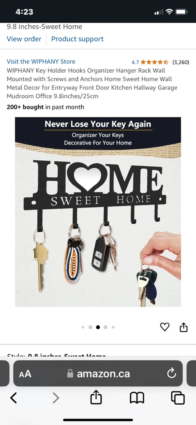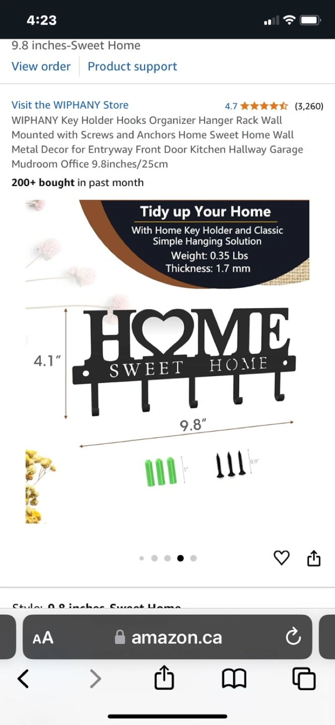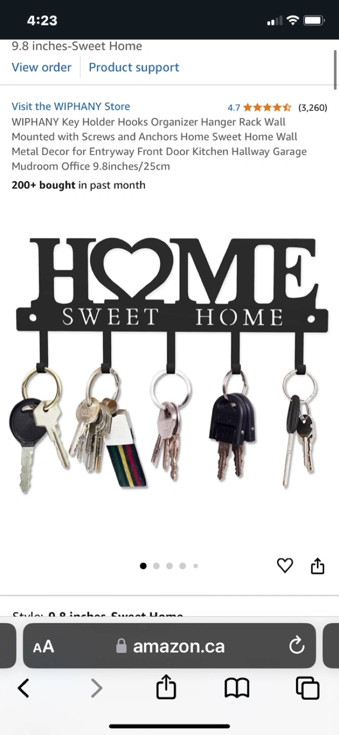 Black metal key holder. Features five hooks. 'Home Sweet Home' design. Wall mounted. Great for entryways, kitchens, or mudrooms.