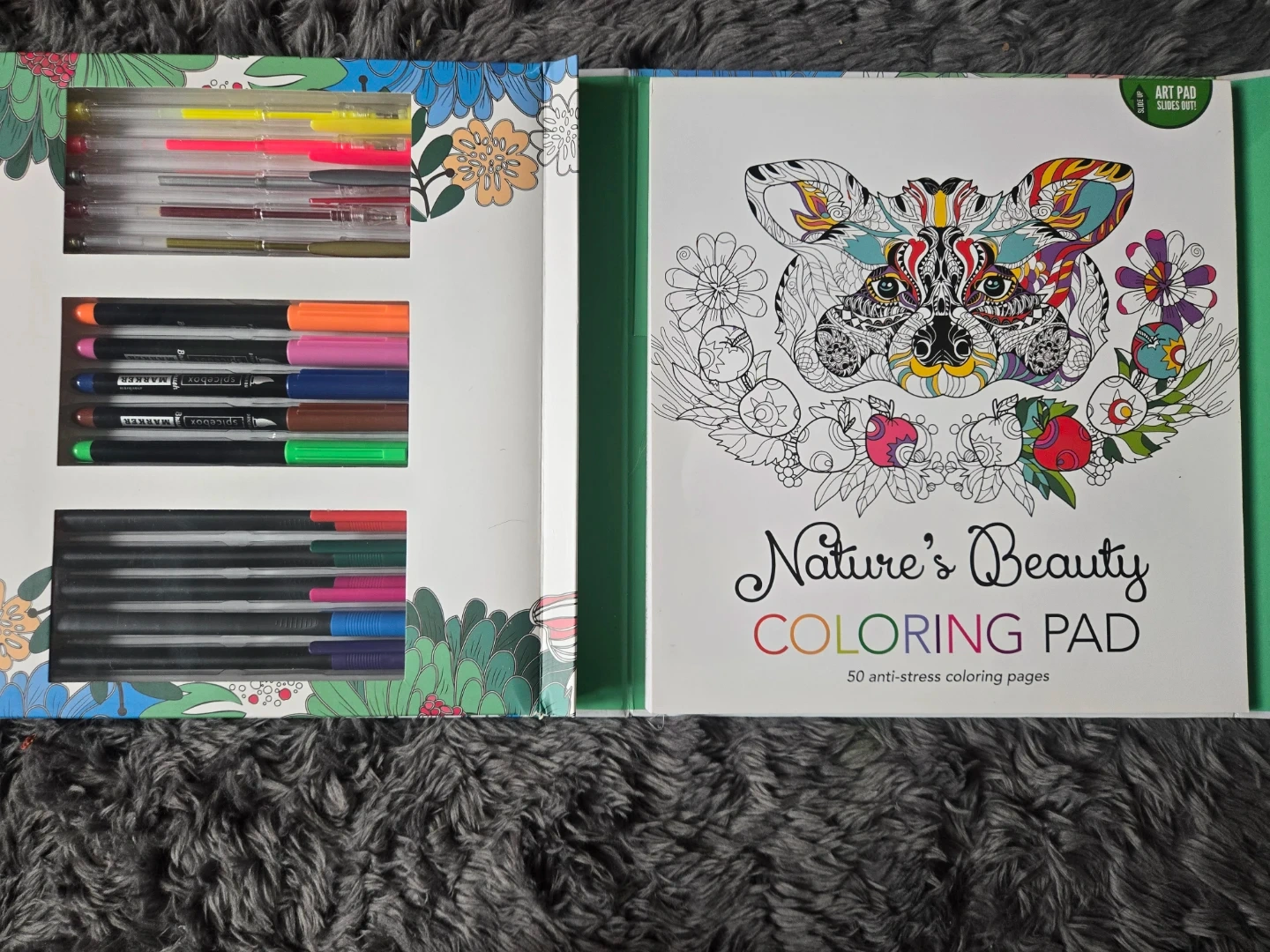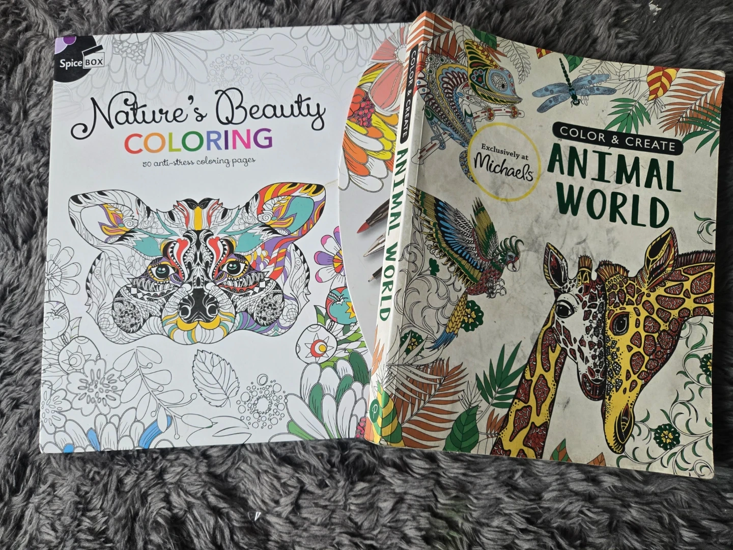 2 intricate animal/nature coloring books, one cones with 5 gel pens, 5 fine tip markers, and 5 brush tip markers.