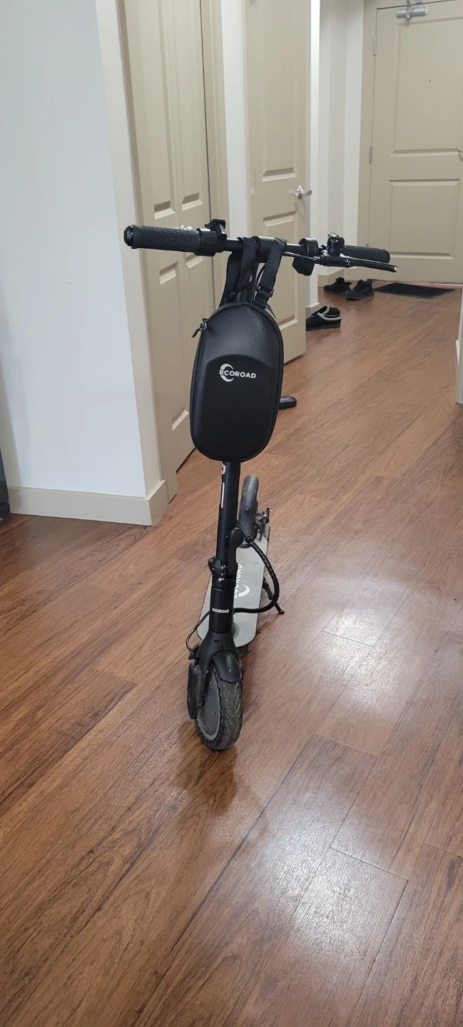 ECO-ROAD electric scooter. Black storage bag attached to handlebars. Good for short commutes or getting around town!