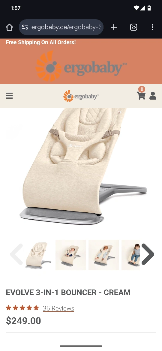 61ERGOBABY EVOLVE 3-IN-1 BOUNCER - CREAM Never used a baby bouncer and in very good condition. From pet free and smoke free home. see the entire description with the original price https://ergobaby.ca/ergobaby-3-in-1-evolve-bouncer-cream it's a very good deal for the new baby bouncer. price is not negotiable.