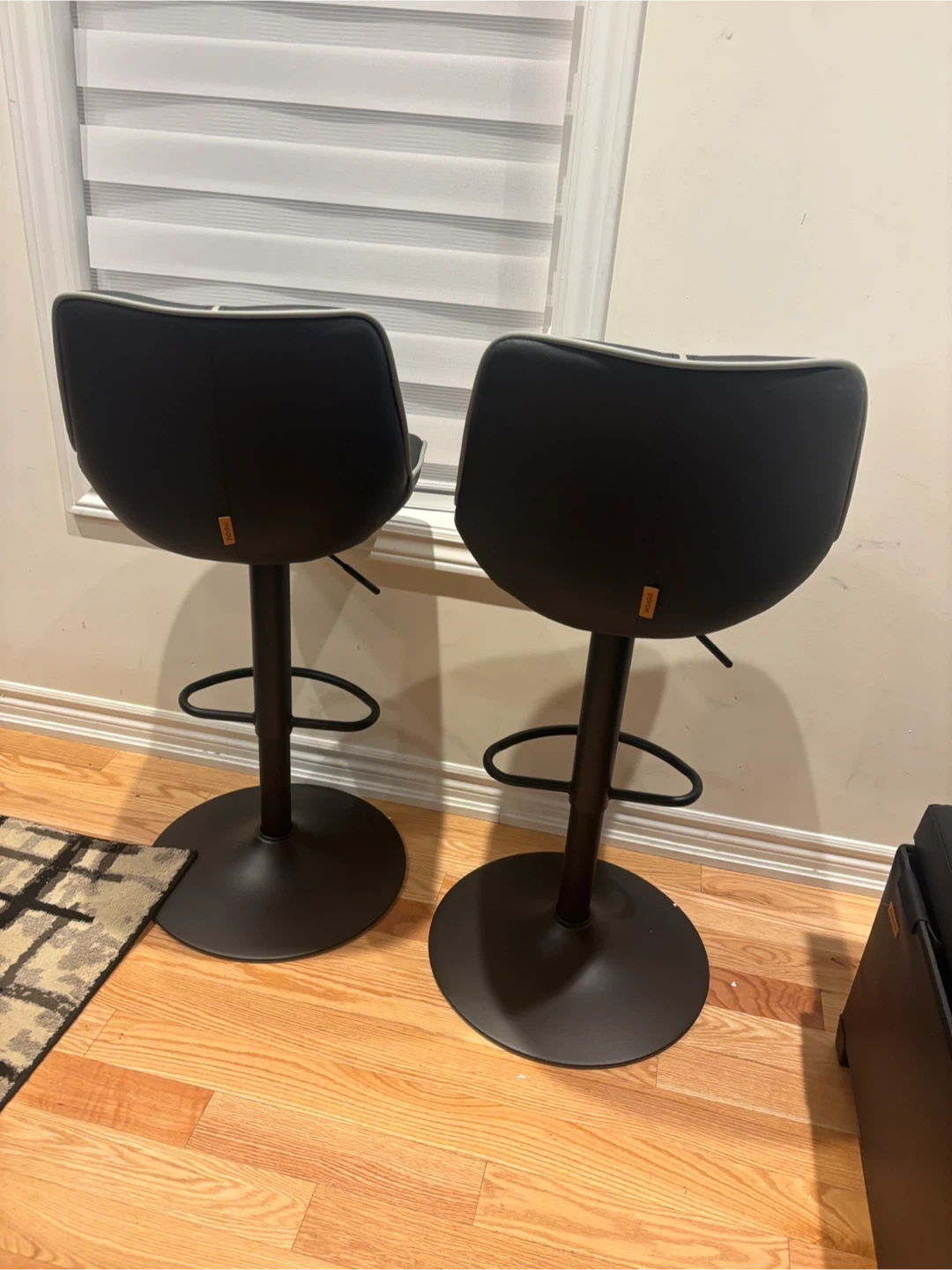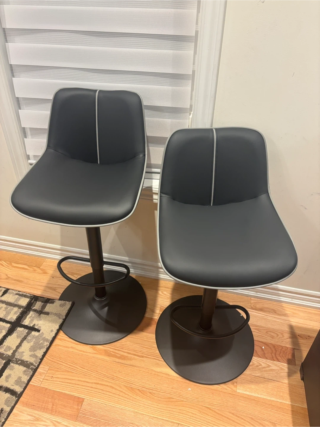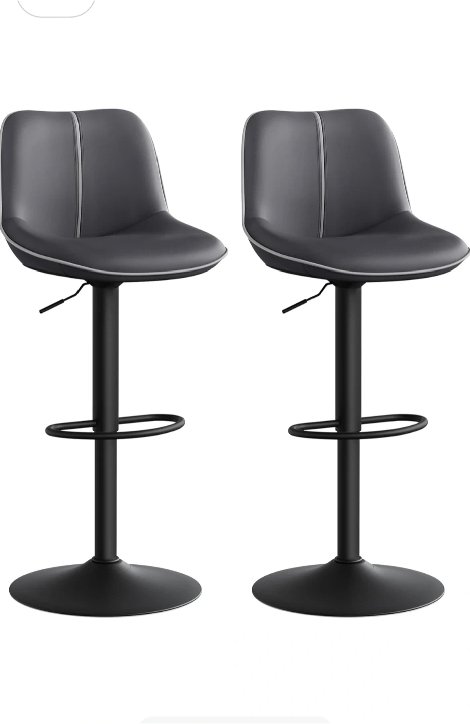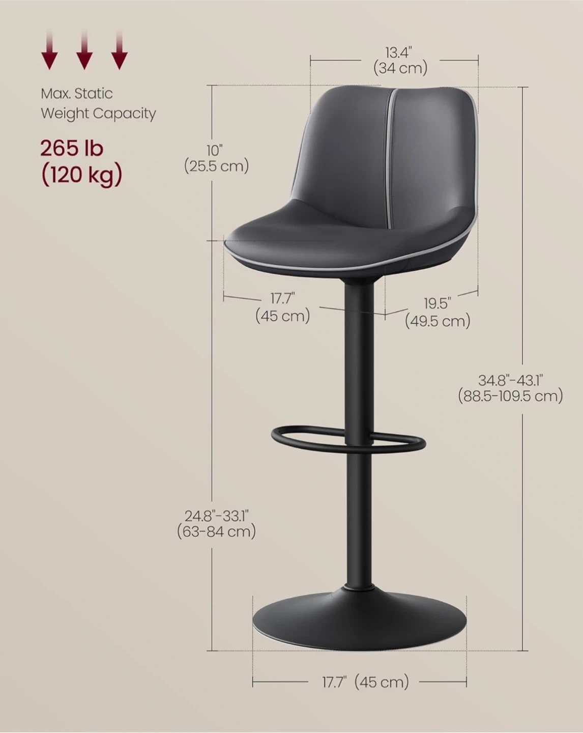 202Adjustable Height Swivel Barstools with Ergonomic Backrest, Synthetic Leather, Larger Metal Base, Modern Tall Bar Chairs for Kitchen Island Home Bar, Ink Black The dimensions are: - 13.4" (34 cm) wide - 10" (25.5 cm) high (seat back) - Seat is 17.7" (45 cm) deep and 19.5" (49.5 cm) wide - Adjustable height from 34.8-43.1" (88.5-109.5 cm) - Base is 17.7" (45 cm) wide Each stool can hold up to 265 lb (120 kg) Available for pickup and delivery