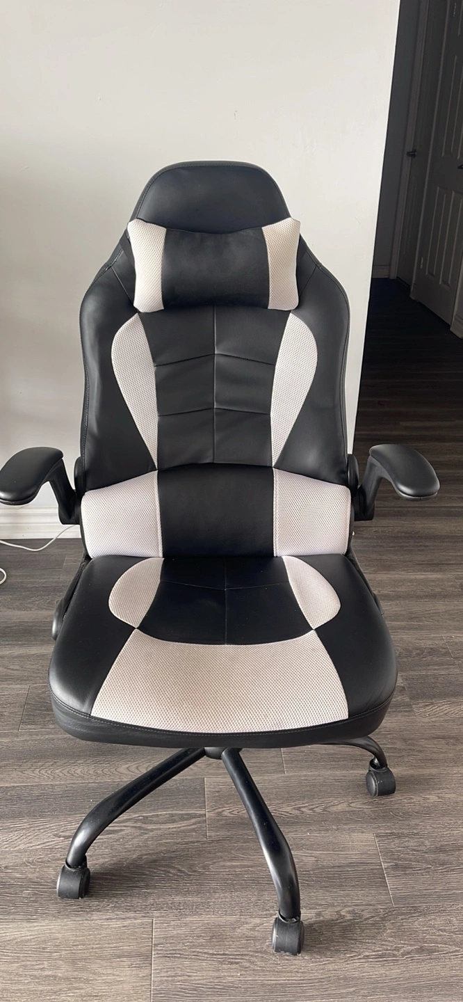 26Ergonomic office chair, Colour- black white with Lumbar support. Executive Swivel rolling chair for Back pain . Material - Metal Nylon Product Dimension : 62D * 69W * 120H centimetres. About this item 1. Extra Comfort - unique appearance and thickly cushioned for Maximum comfort. 2. No installation needed 3. Muti purpose function to office chair - Chair covered by breathable premium PU leather with freely adjustable lumbar support and heardest pillow protecting your spinal and neck. It has locking in any position when you recline, safe angle 90-135 degree. 4. Convergence to move anywhere