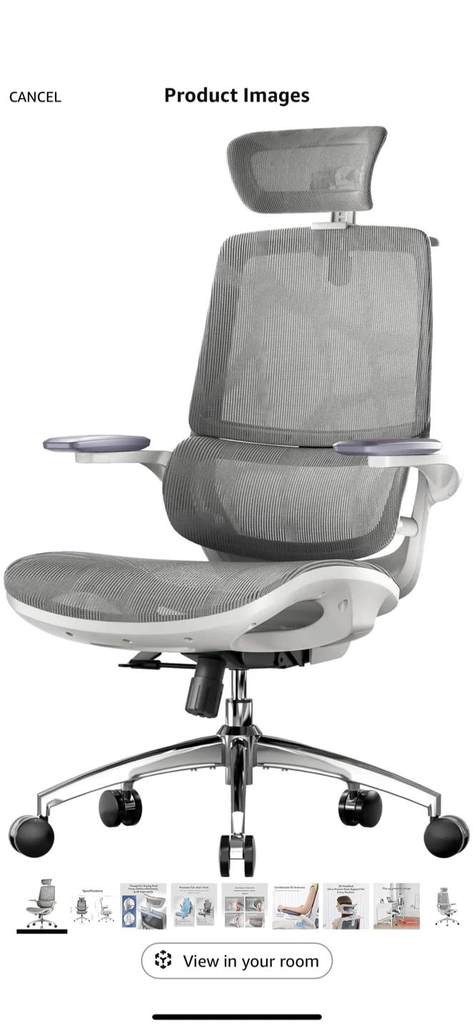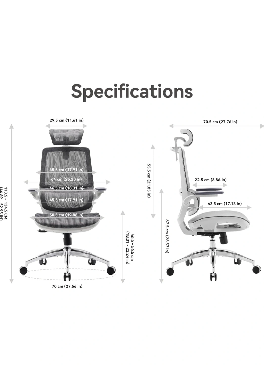 Selling a comfortable ergonomic office chair in gray! It features a thoughtful drying rack to hang clothes or grab bags effortlessly. Here are the dimensions: - Headrest: 11.61 in - Seat: 19.88 in - Height: Adjustable from 44.69 to 52.95 cm