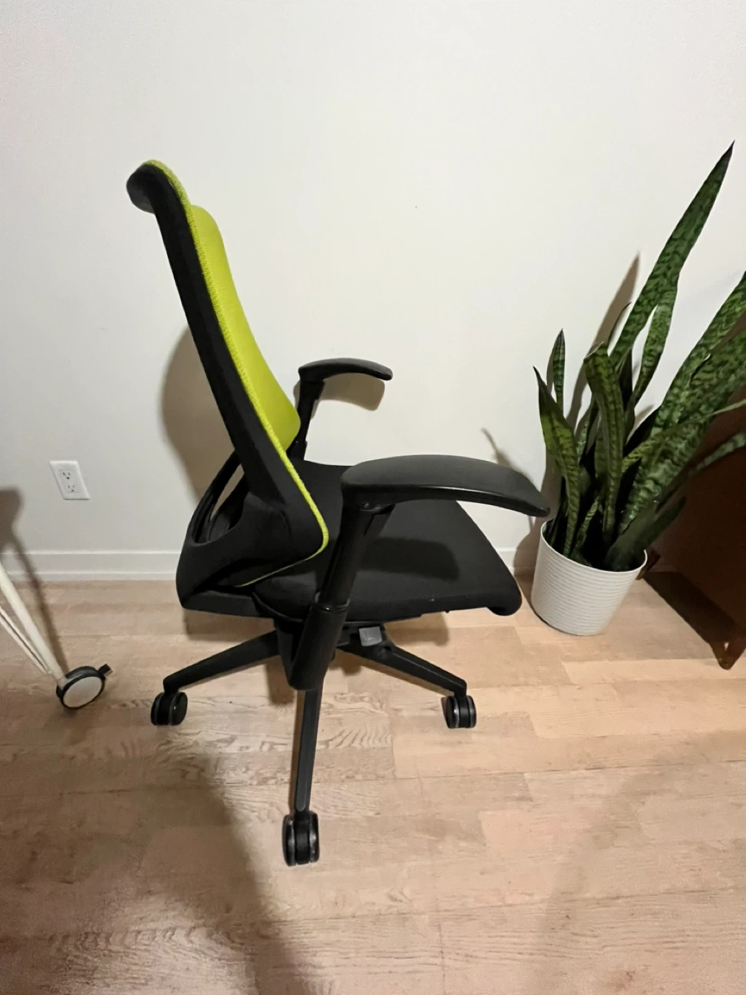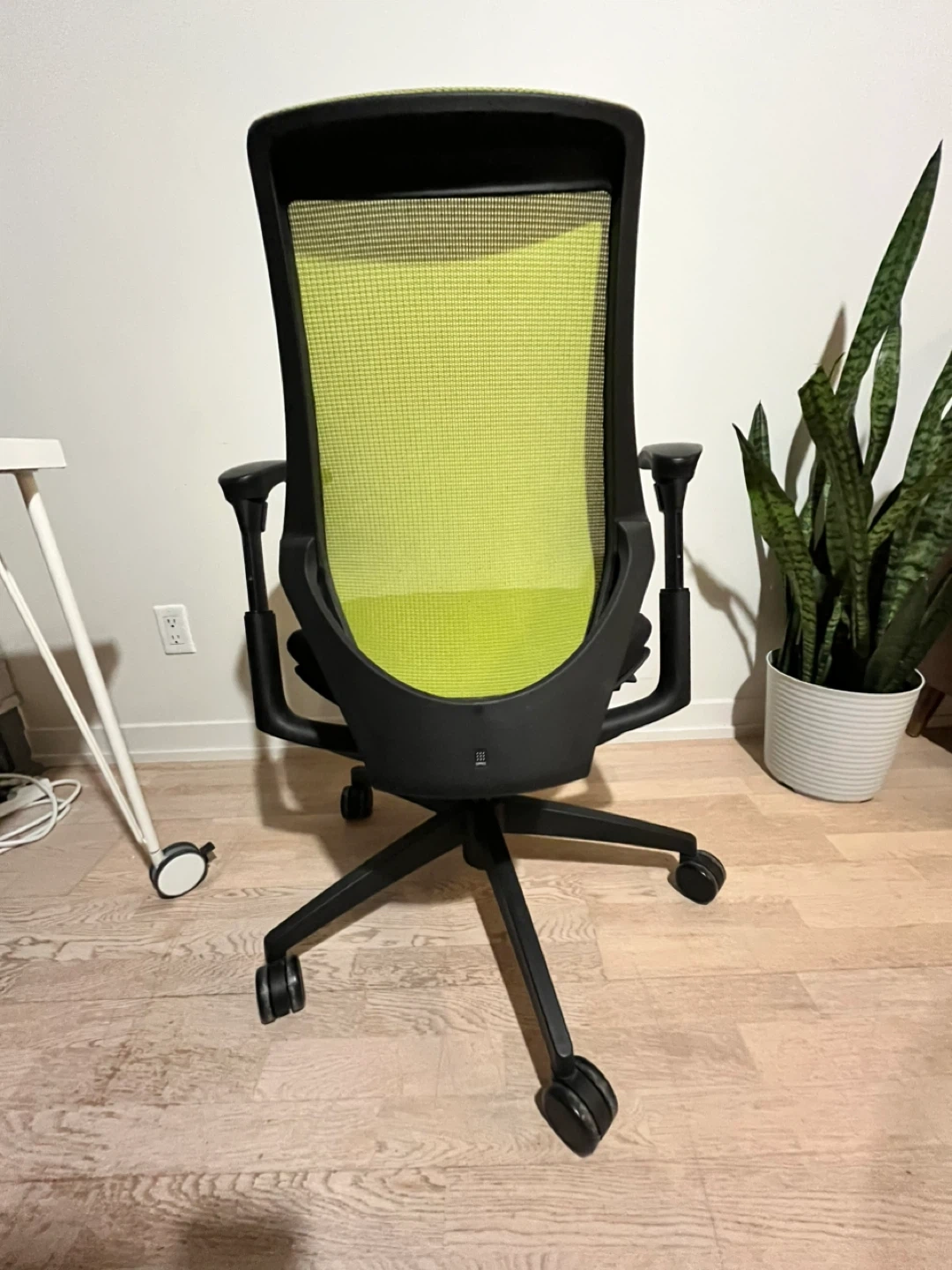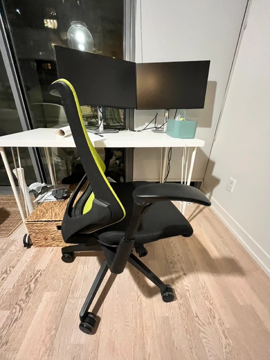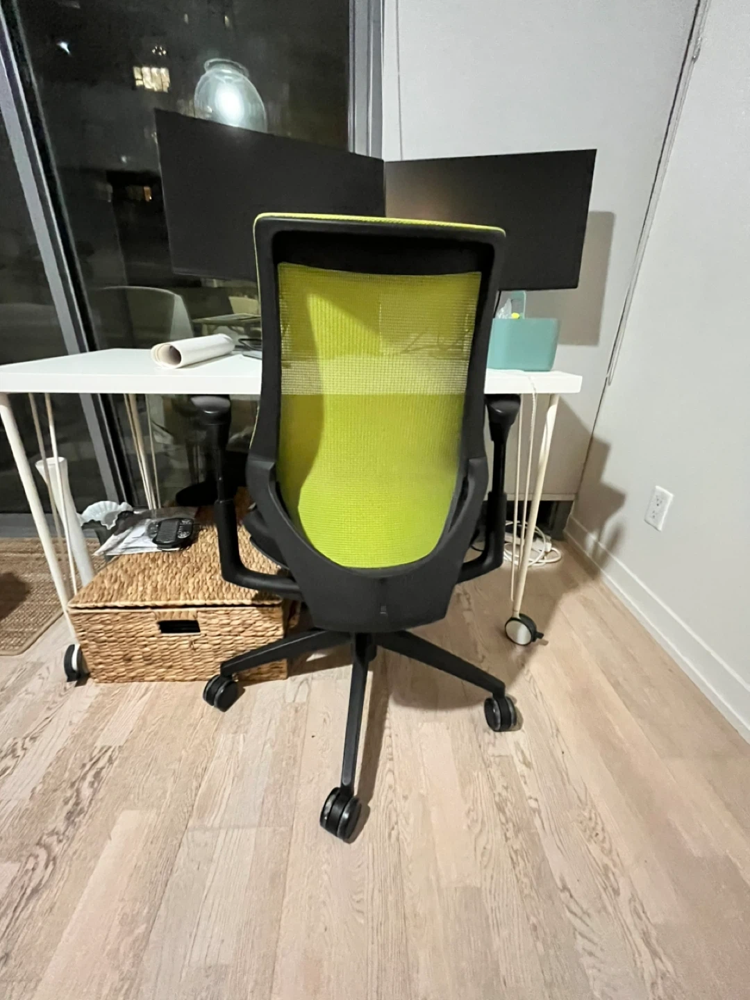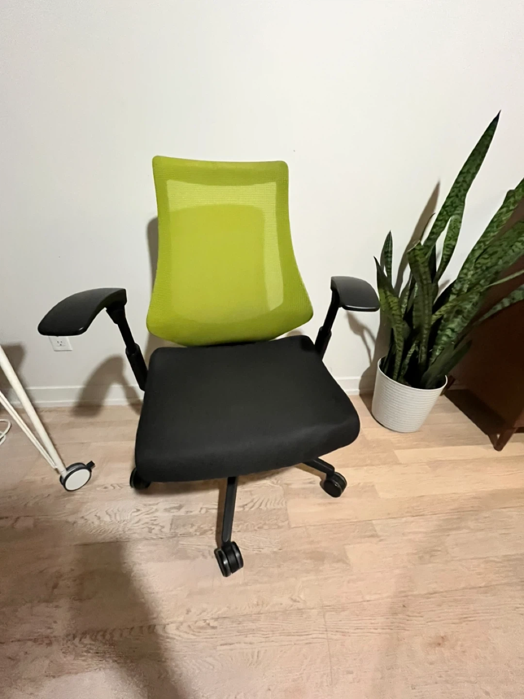 21Selling a comfortable ergonomic office chair. It features a black frame with a vibrant green mesh back for breathability. The chair is in used condition, with some wear on the seat as shown in the photos. Great for home or office use! $50 or best offer, really need to get this chair a new home!