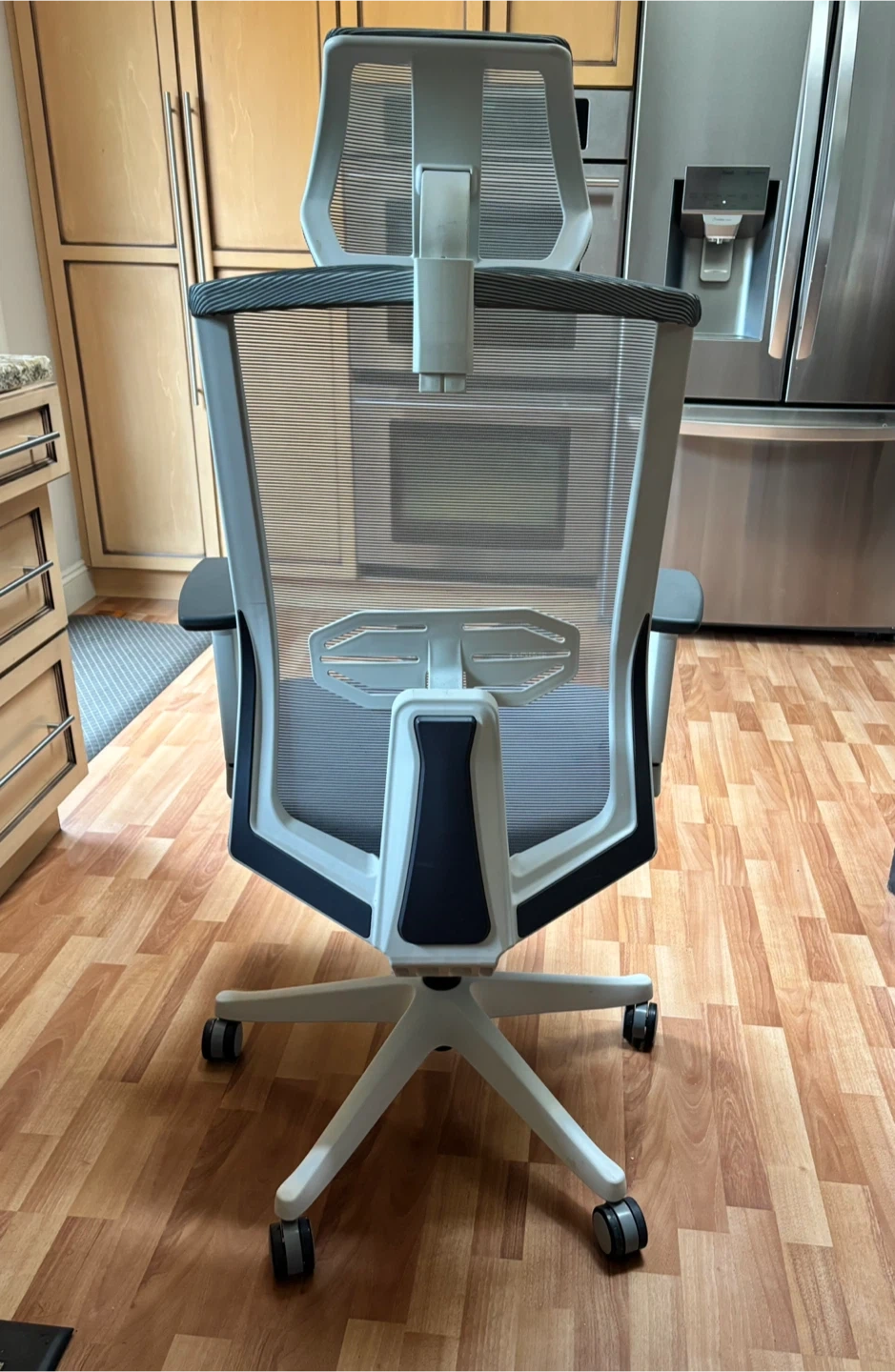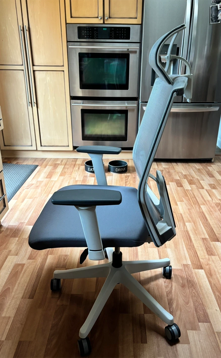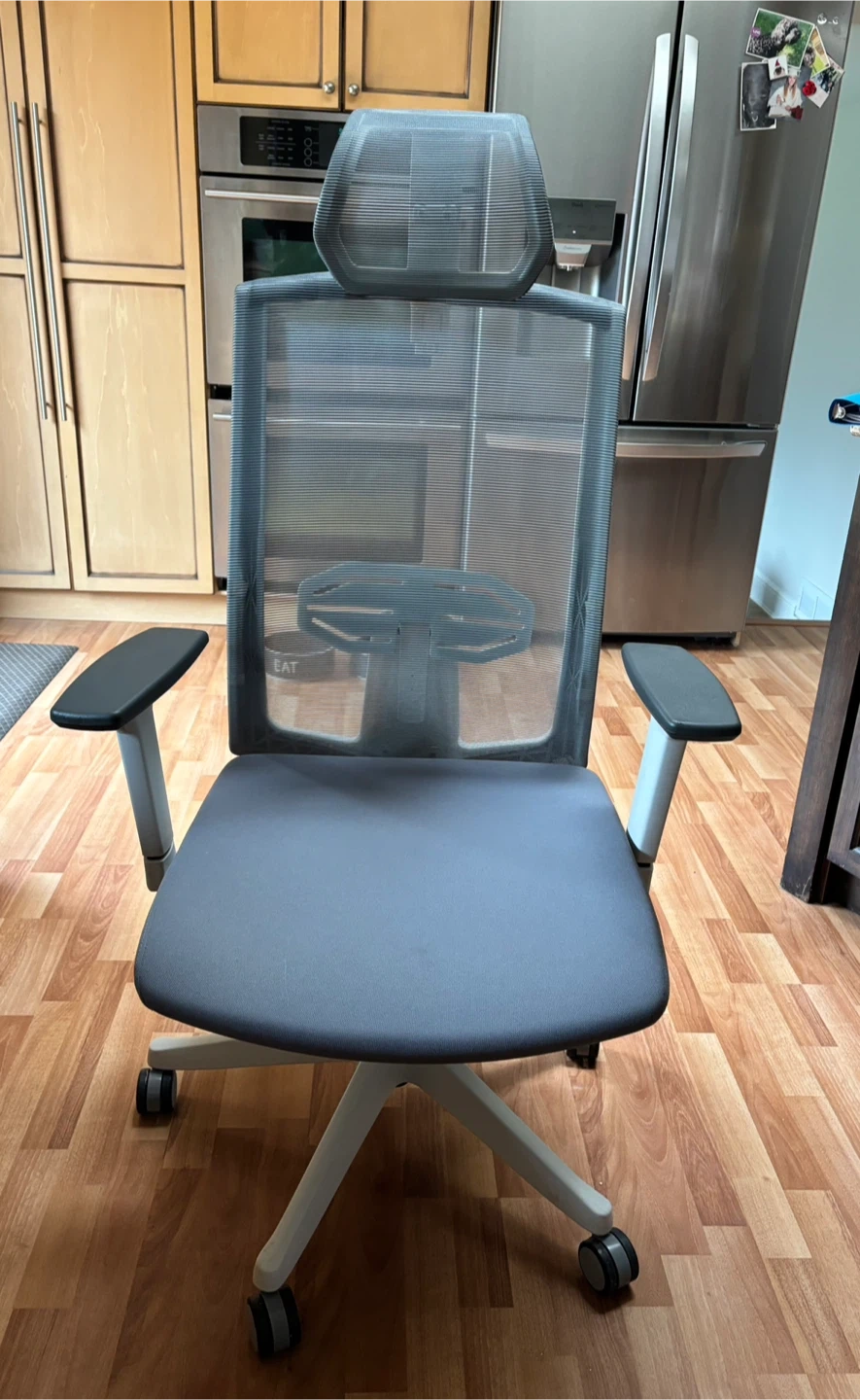 Selling a comfortable ergonomic office chair in great condition! It features a breathable mesh back, adjustable headrest, and supportive armrests. The chair is grey with a white base and provides excellent lumbar support for long hours at your desk. Perfect for anyone looking to upgrade their home office setup