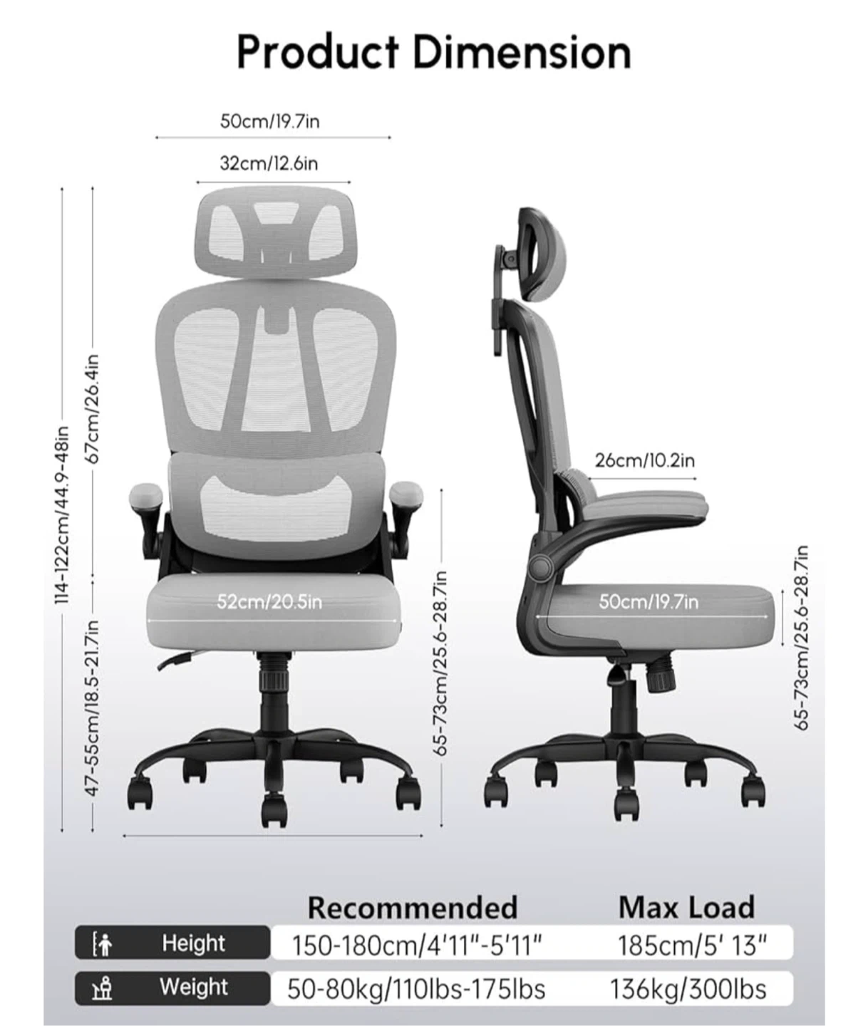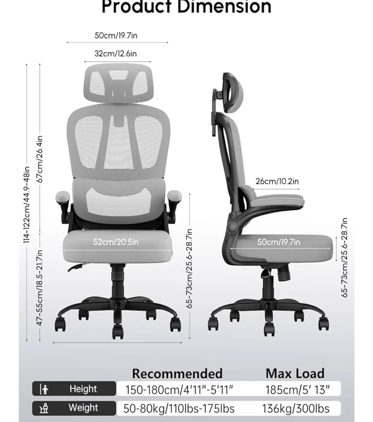 Selling a comfortable ergonomic office chair! It features a split lumbar support system and full angle support for maximum comfort. Here are the product dimensions: - Headrest: 50cm/19.7in x 32cm/12.6in - Height: 114-122cm/44.9-48in - Seat: 52cm/20.5in - Depth: 65-73cm/25.6-28.7in - Armrests: 47-55cm/18.5-21.7in Recommended height: 150-180cm/4'11"-5'11" Weight recommendation: 50-80kg/110lbs-175lbs Max load: 185cm/5' 13" or 136kg/300lbs