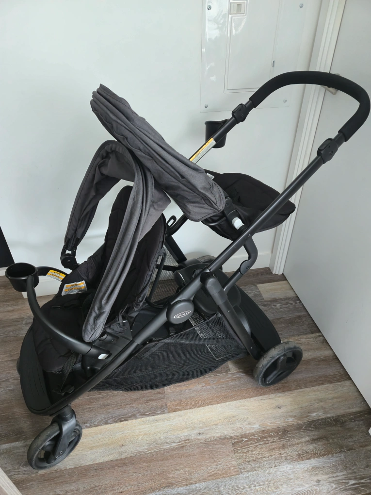 Great double stroller, versatile design. Two stroller seats, bench seat, or standing platform configurations. With winter cover.