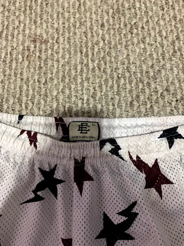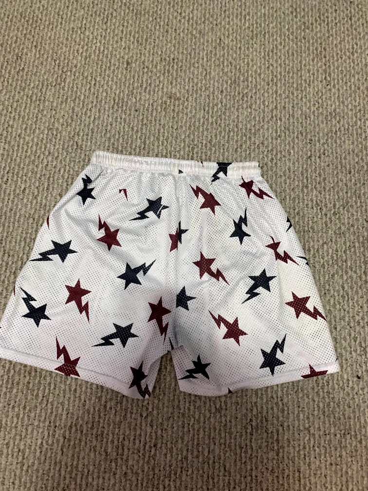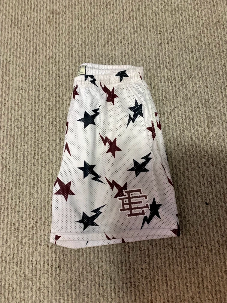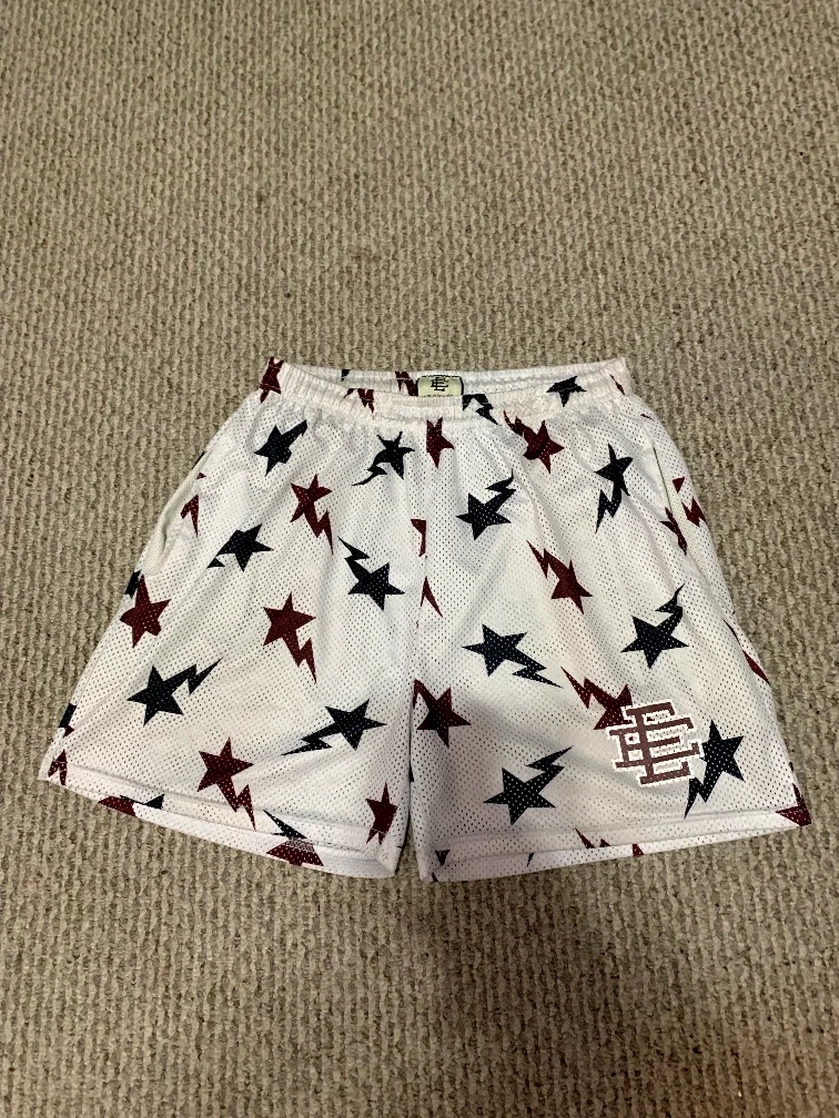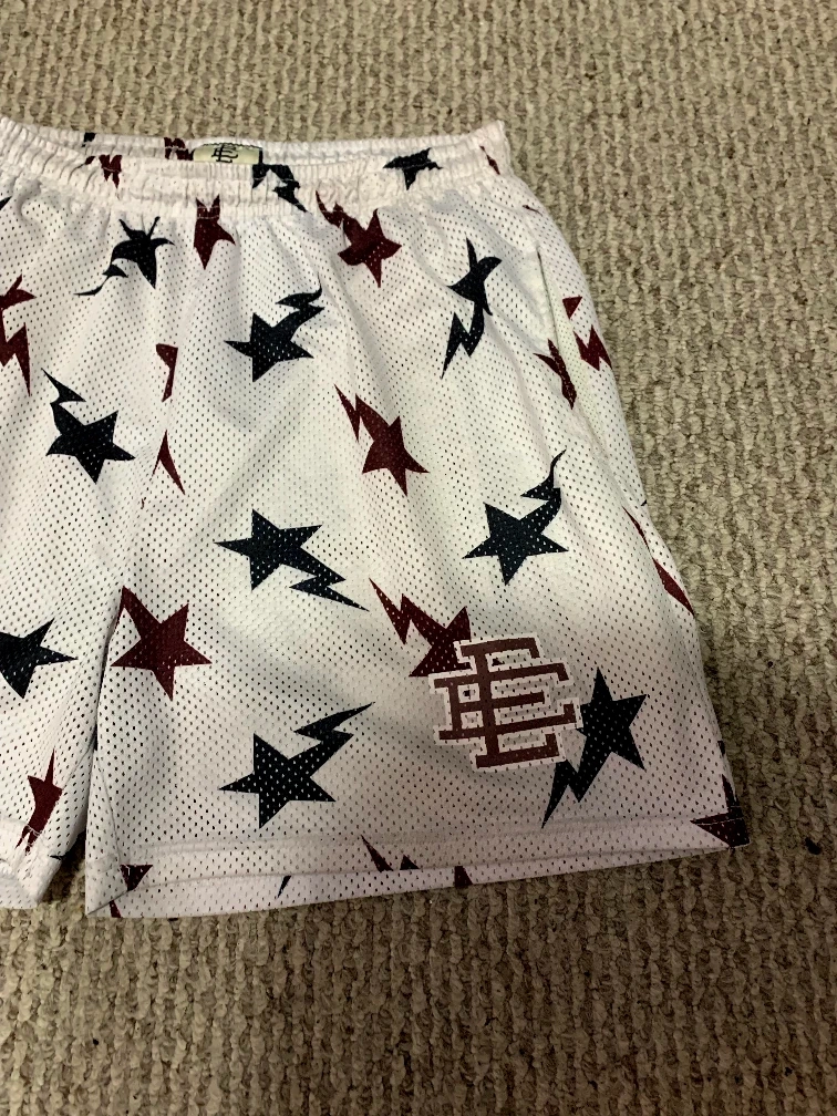 These Eric Emanuel EE Basic Shorts are in great condition and ready for a new home! They're a size M-L and feature a cool star and lightning bolt design on a white mesh material