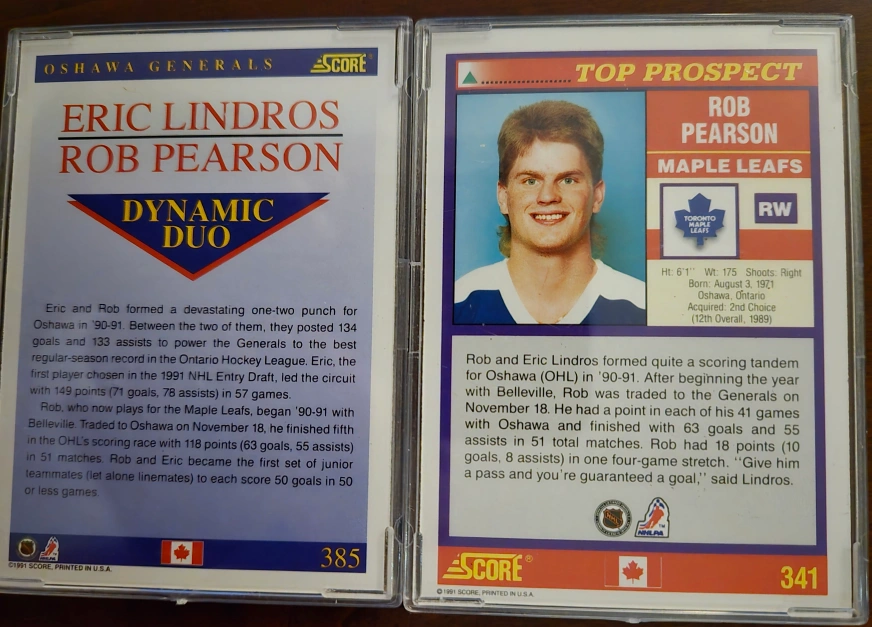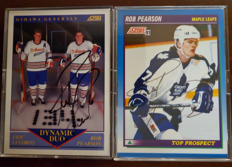 Selling two vintage hockey cards: Eric Lindros & Rob Pearson 'Dynamic Duo' and Rob Pearson 'Top Prospect' Maple Leafs card. Both cards are Autographed by Rob Pearson. Both are from the Score '91 series and in great condition!