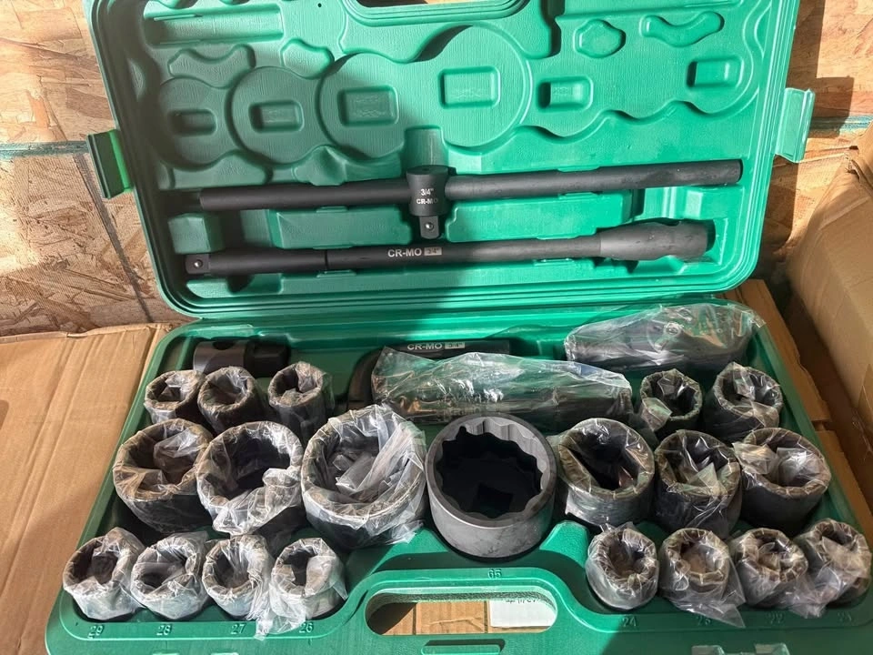 This 26-piece SAE set includes both 3/4” drive and 1” drive sockets, along with handles and extensions — all neatly packed in a durable green plastic case for easy storage and transport.