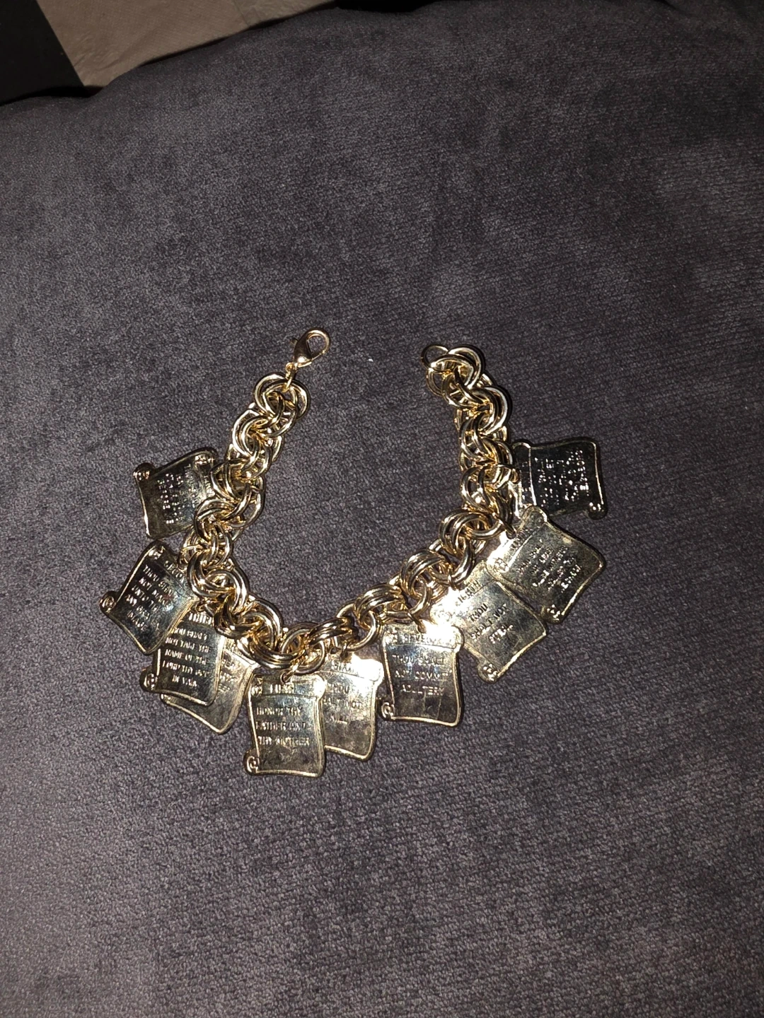 Gold tone charm bracelet with multiple charms, each engraved with one of the Ten Commandments. Clasp closure. Great for a statement piece!