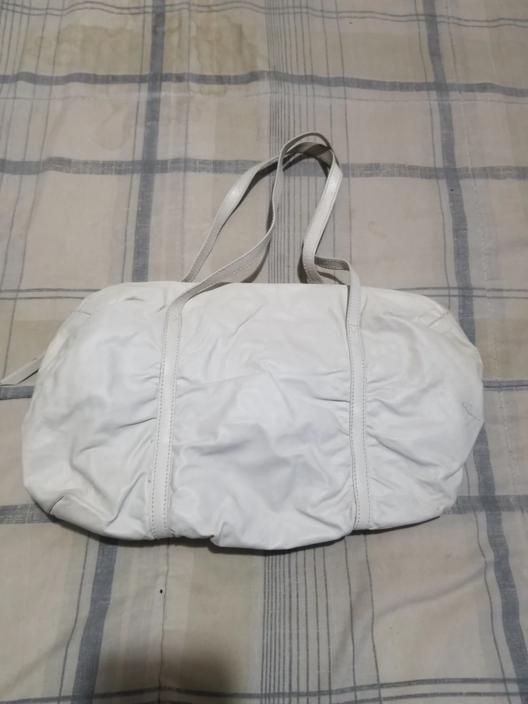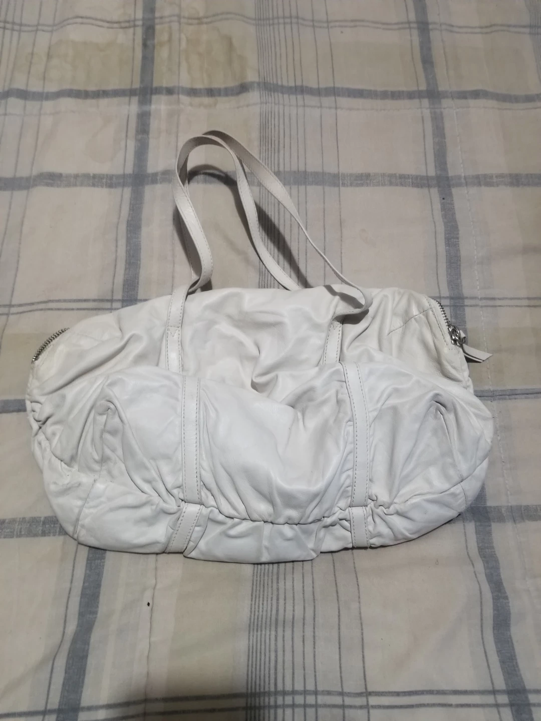 This is a white leather handbag by Club Monaco. It features a zippered closure and two shoulder straps. The interior is lined with fabric. Great Condition Asking only $12 for it! If Interested Let Me Know I have more Bags as We'll 😯😊