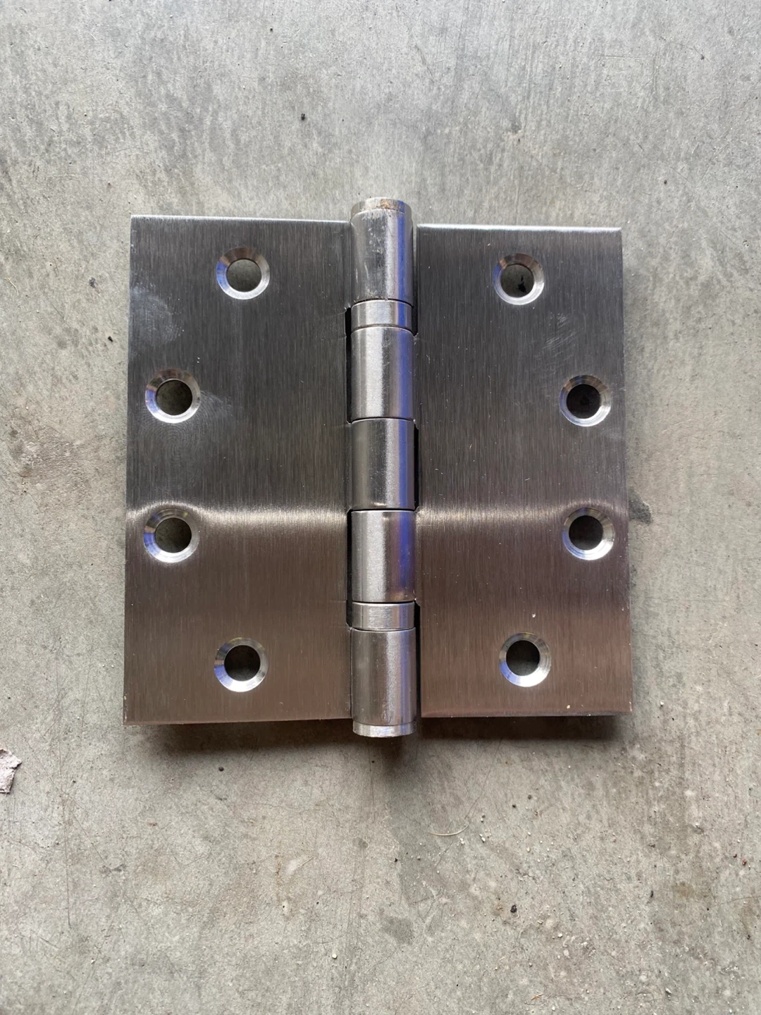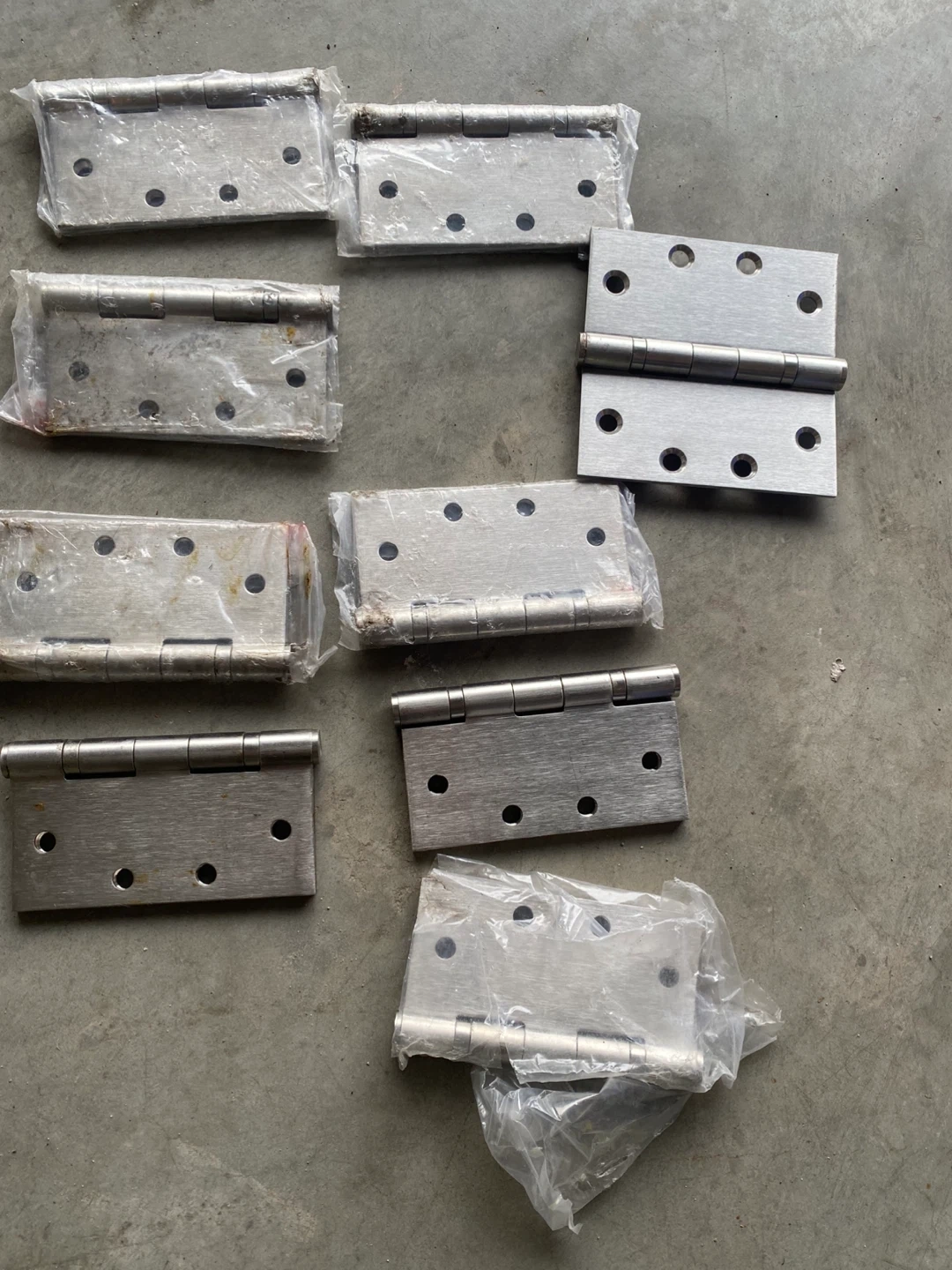 9 stainless steel door hinges are available. Each hinge measures approximately 4 inches by 4 inches and has a brushed finish. These are standard residential door hinges.