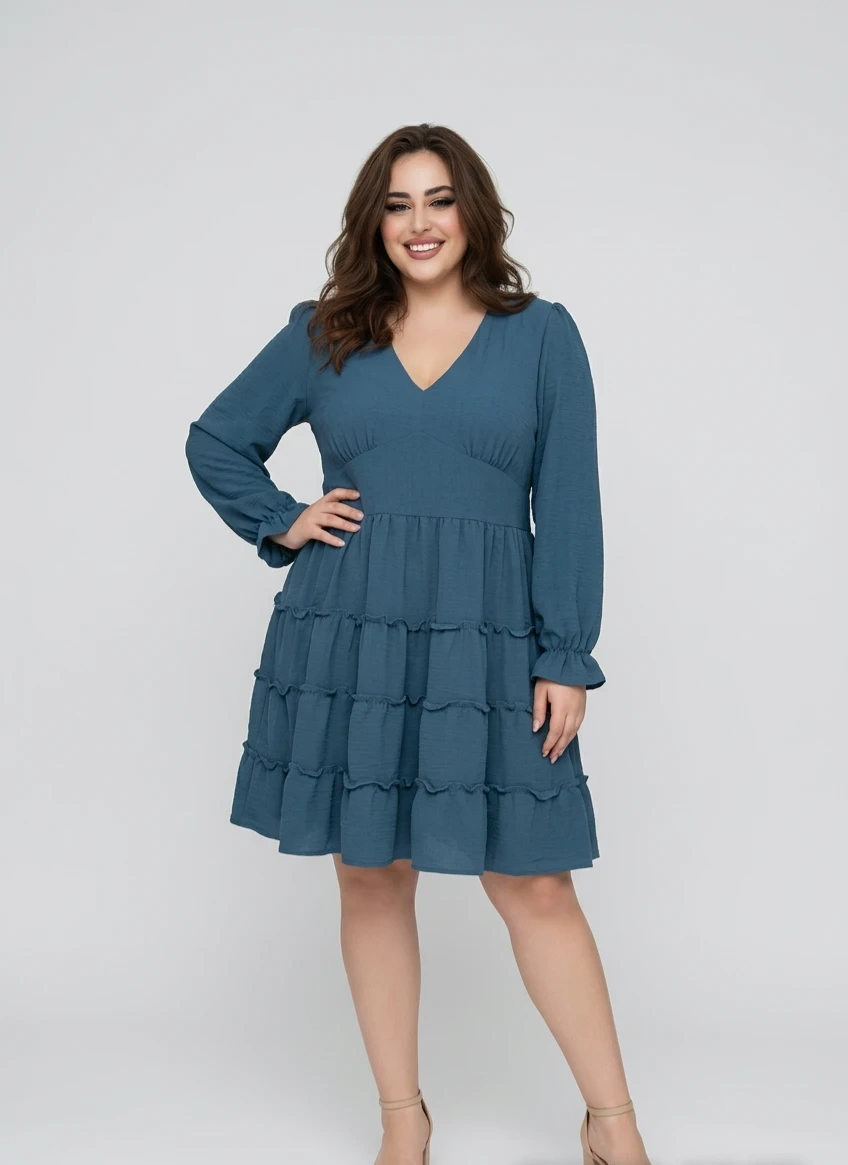 Chic blue dress with a flattering V-neck and long sleeves. It features a tiered ruffle skirt for a playful touch. Made from a textured fabric.