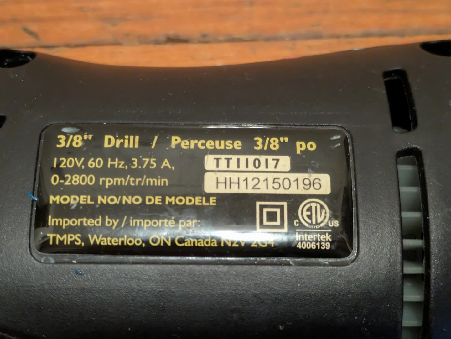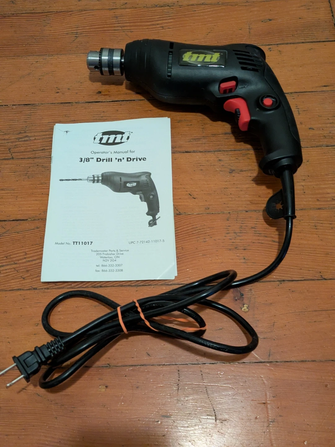 This is a TMT 3/8" drill. It operates at 120V, 60 Hz, and 3.75 A, with a speed of 0-2800 rpm. It includes the operator's manual. No Drill bit.
