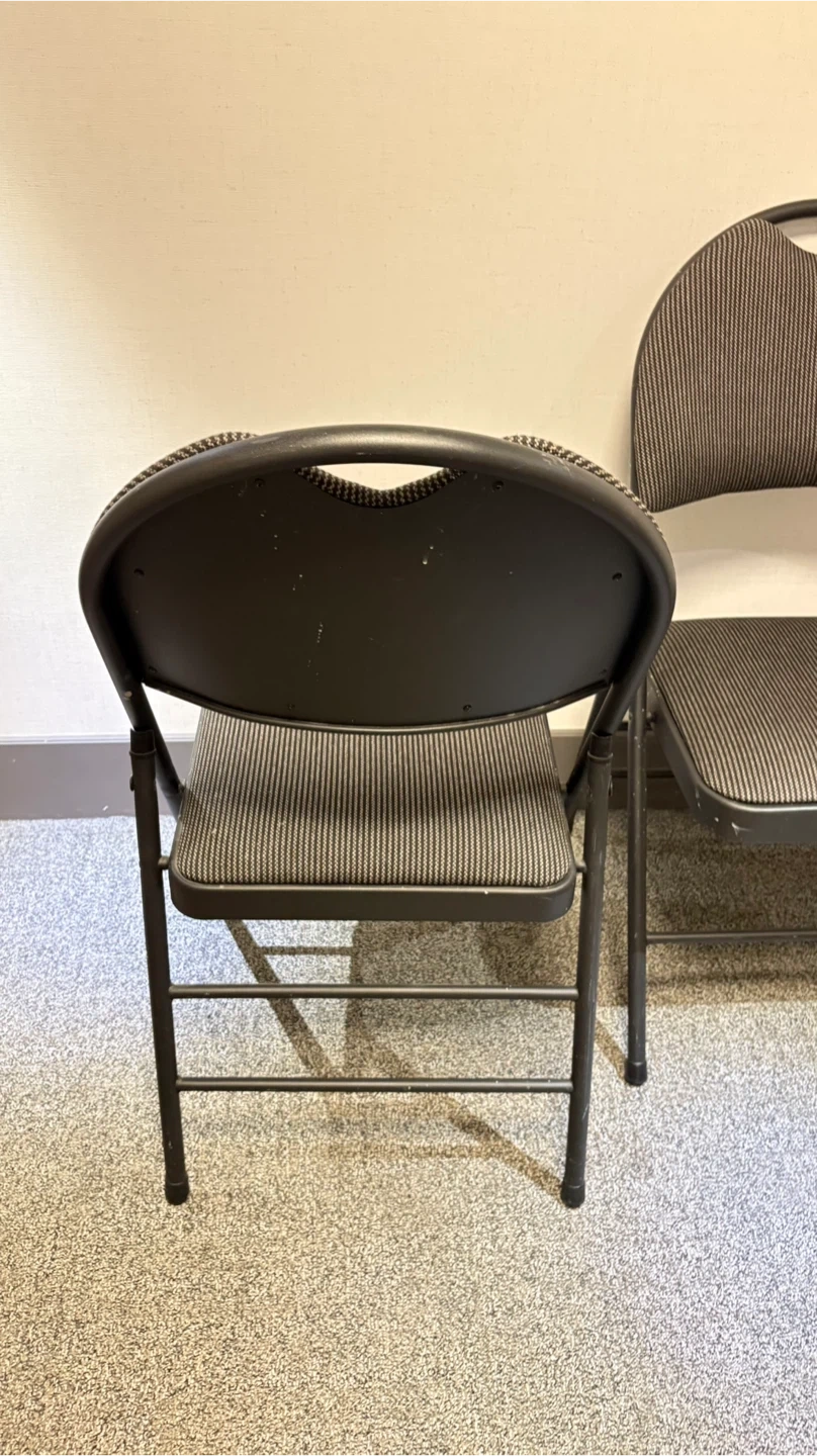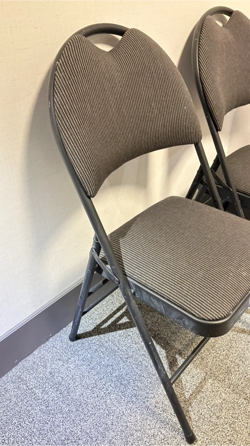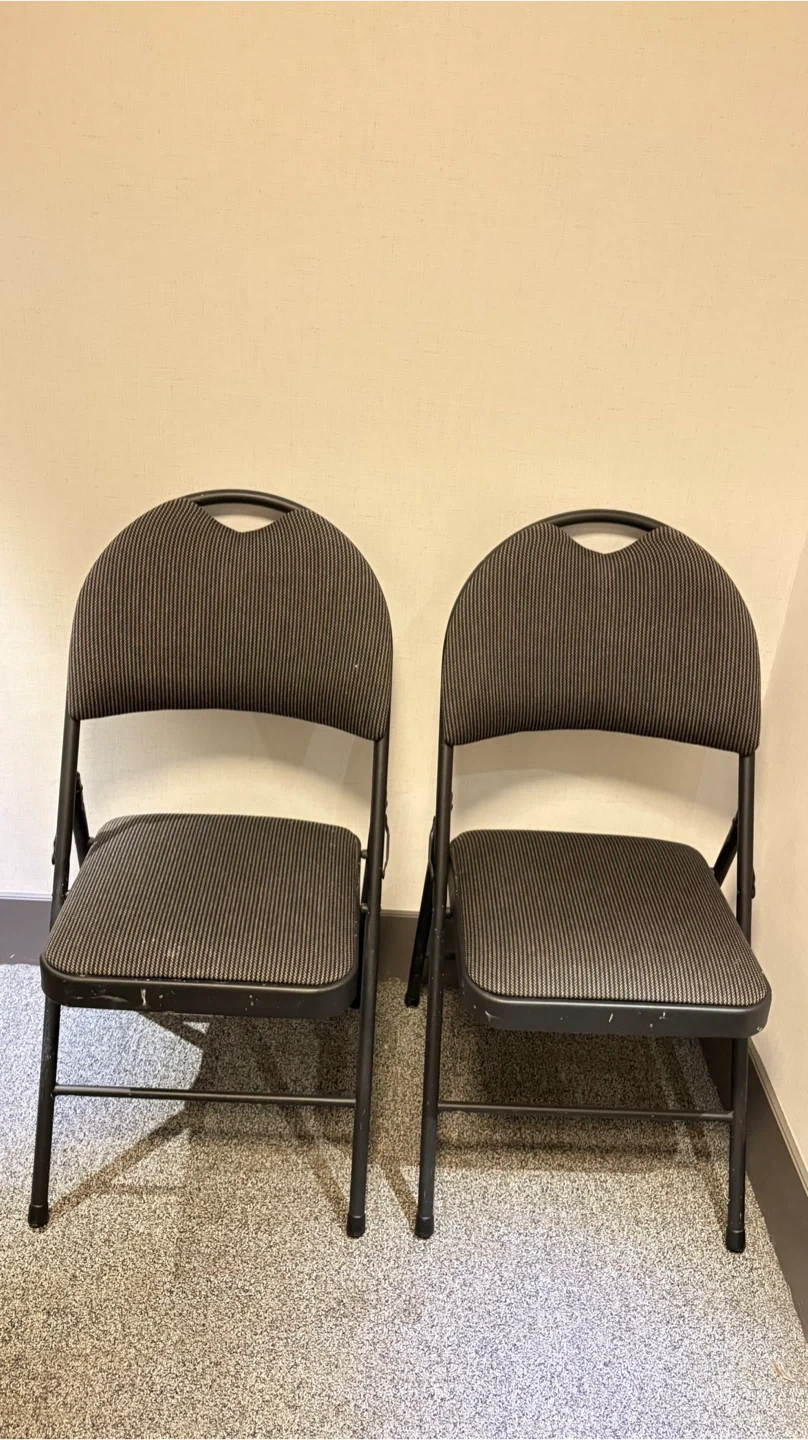 Selling a set of two folding chairs. They're in good condition and perfect for extra seating when you have guests or for events. The chairs have a sturdy metal frame and a comfortable upholstered seat and back. Great for small spaces as they fold up easily for storage!