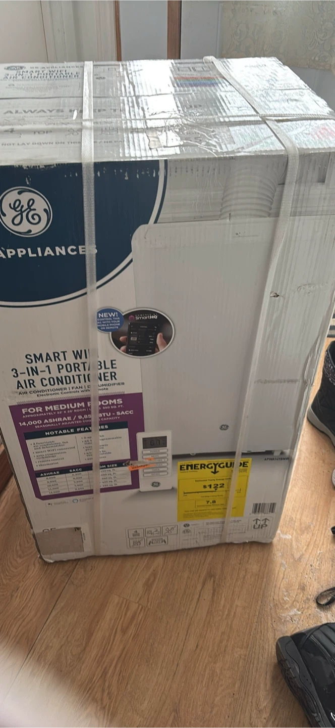Selling a GE Smart WiFi 3-in-1 portable air conditioner! This unit functions as an air conditioner, fan, and dehumidifier. It's designed for medium-sized rooms, approximately 22' x 25', or up to 550 sq ft. The unit has a 14,000 ASHRAE / 9,850 BTU-SACC capacity. The EnergyGuide estimates the yearly energy cost at $122 or 7.8.