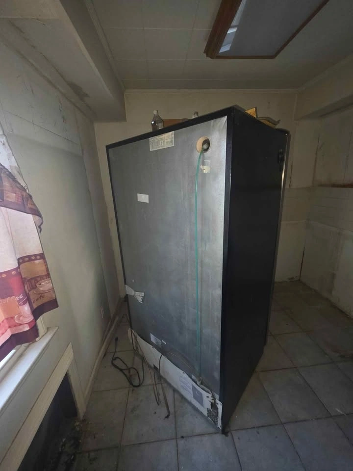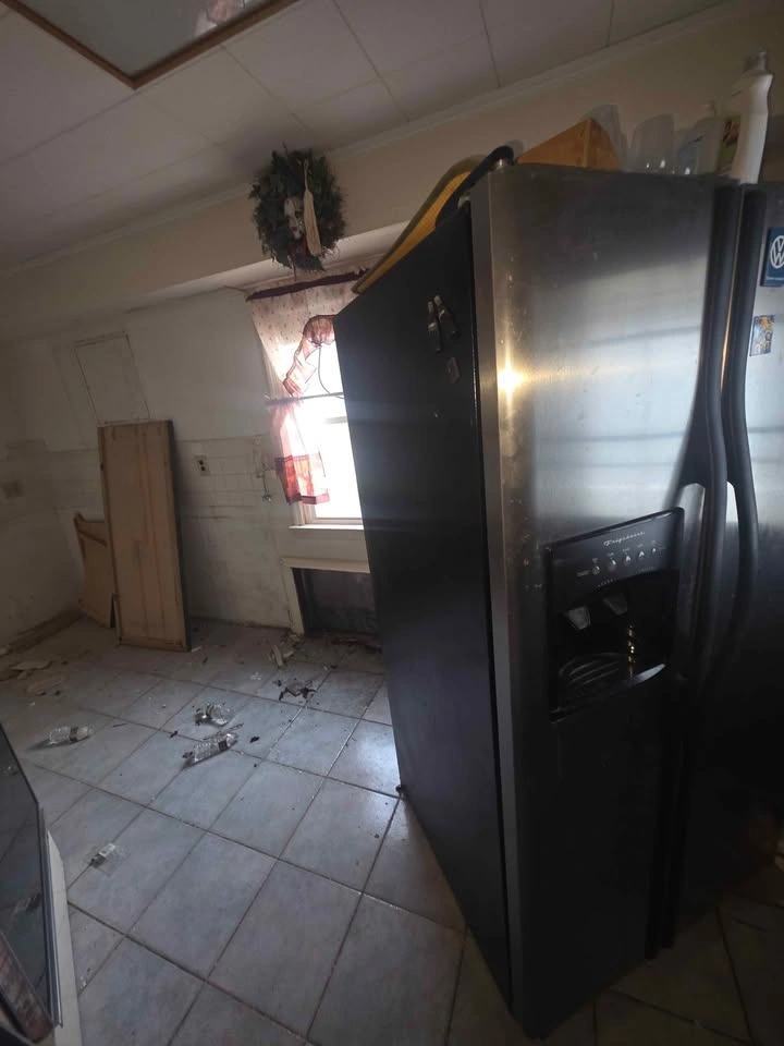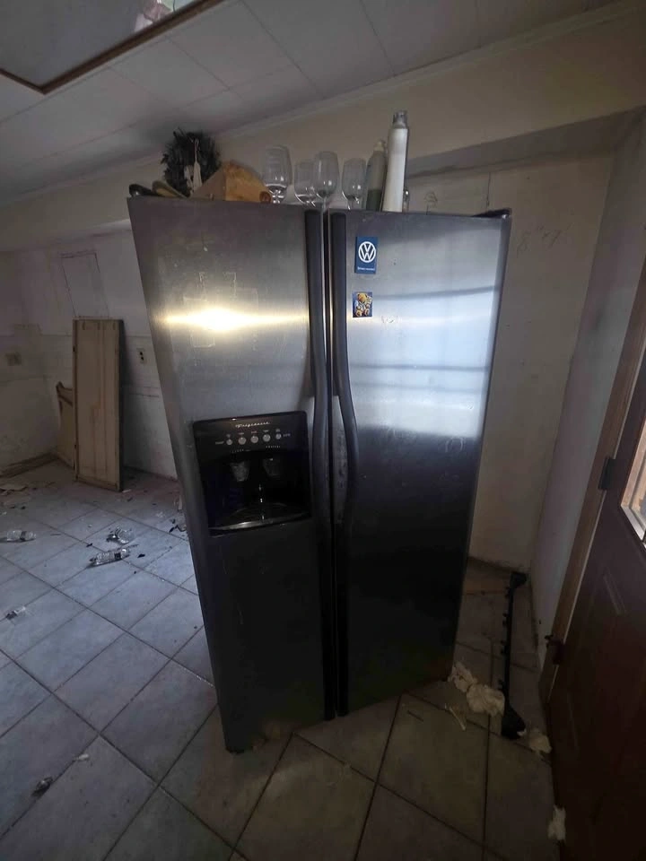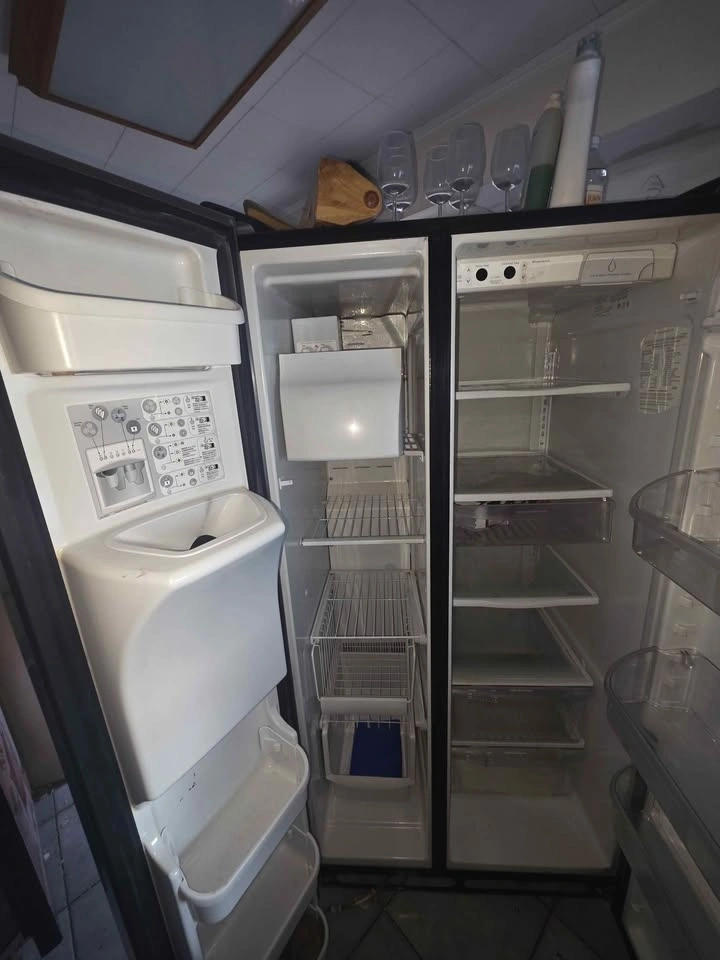 Functional Frigidaire side-by-side refrigerator with a stainless steel finish and a built-in ice and water dispenser. Plenty of shelves and door bins inside for storage. Needs to go!