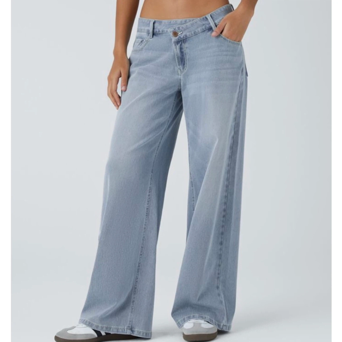 halara, wide, leg, crossover, waist, petite, blue, denim, stretchy, low, rise, hemmed, pants, women