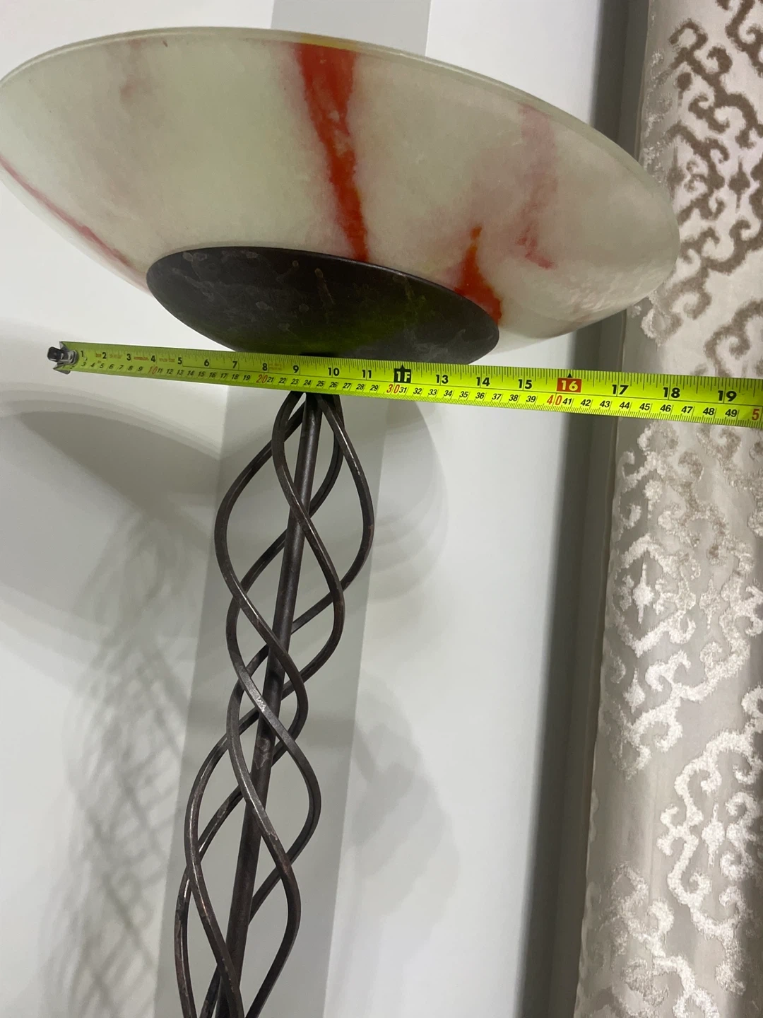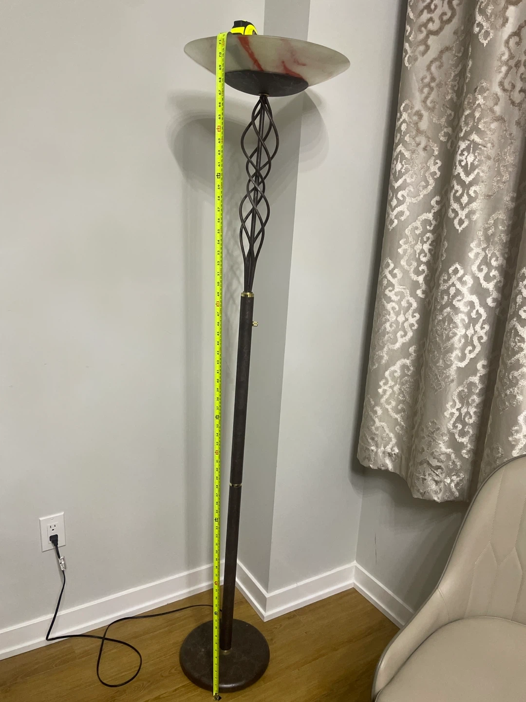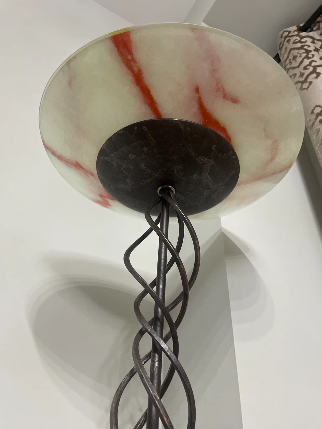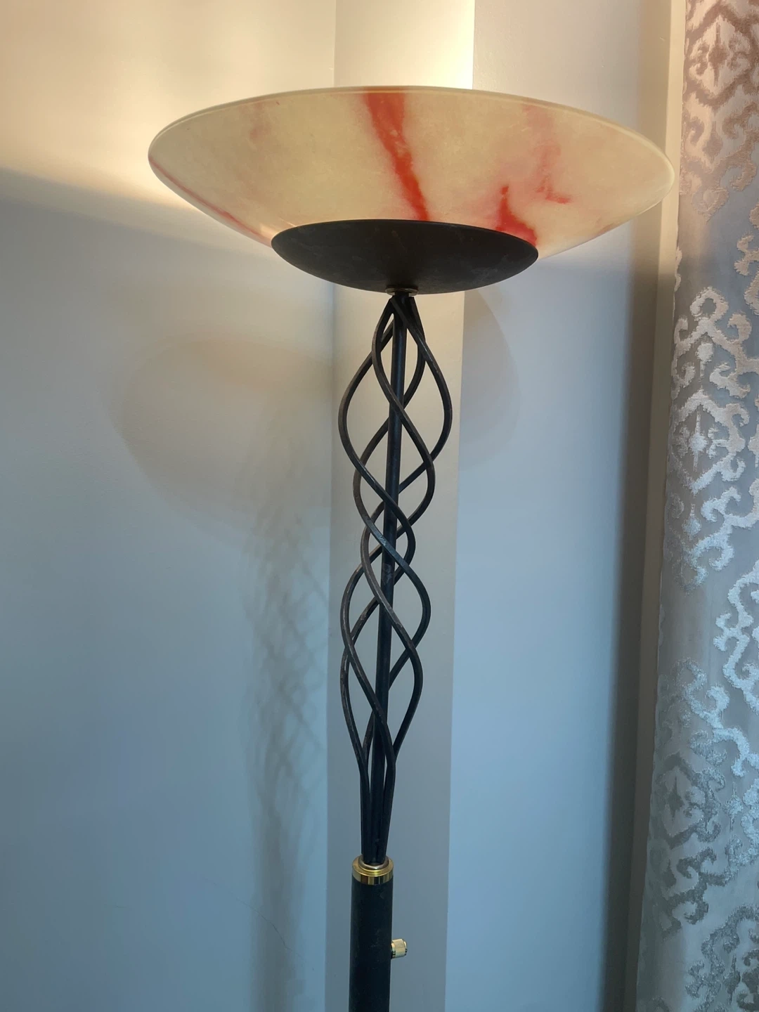 This vintage floor lamp has a unique twisted metal design and an alabaster-style shade with red veining. The base is dark with a marbled effect. It stands approximately 70 inches tall. Adds a touch of elegance to any room!