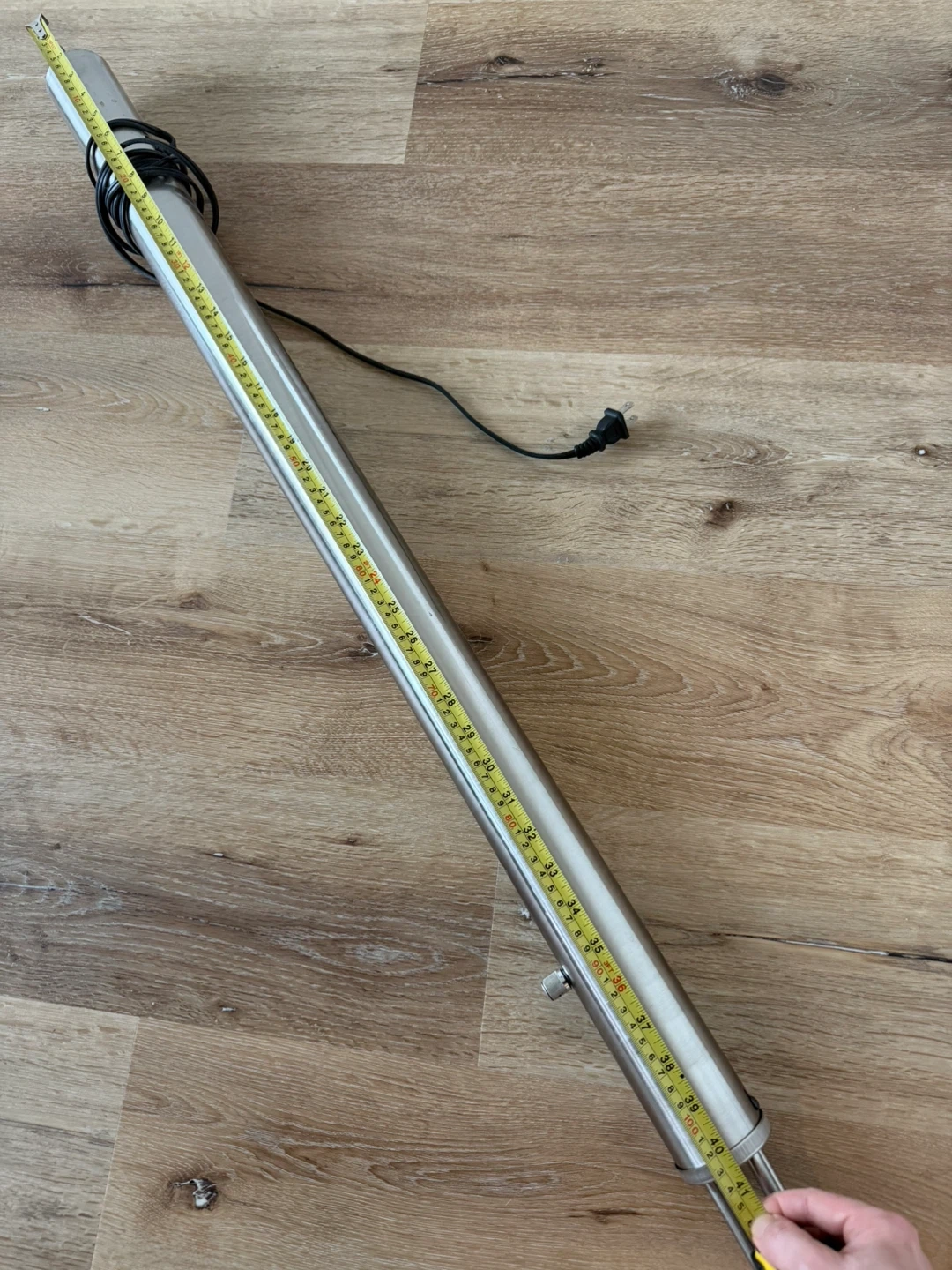 A modern silver floor lamp with five dimmable and adjustable lights. Adjustable, in the sense that they can be spread out, or closer together depending on your space. It's made of metal and has a flexible design. The lamp measures approximately 3 metres long, end-to-end. But only about 2 metres tall otherwise.
