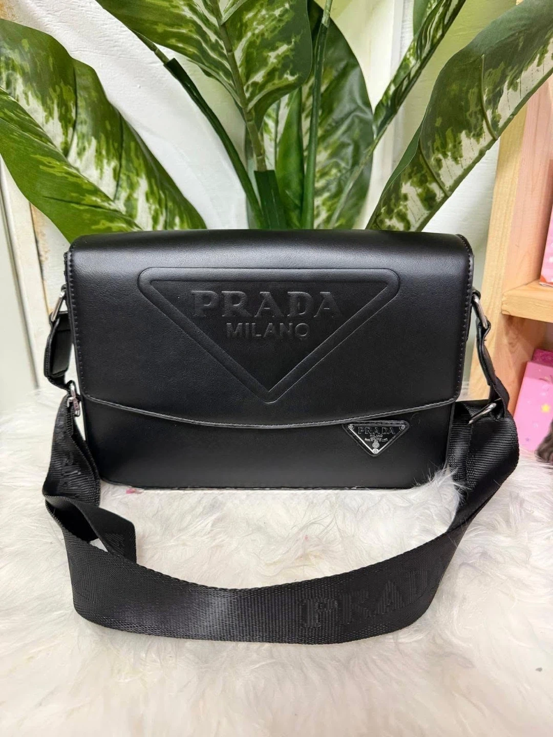 This is a black leather shoulder bag from Prada Milano. It features an embossed logo and a patterned strap. Made of leather.