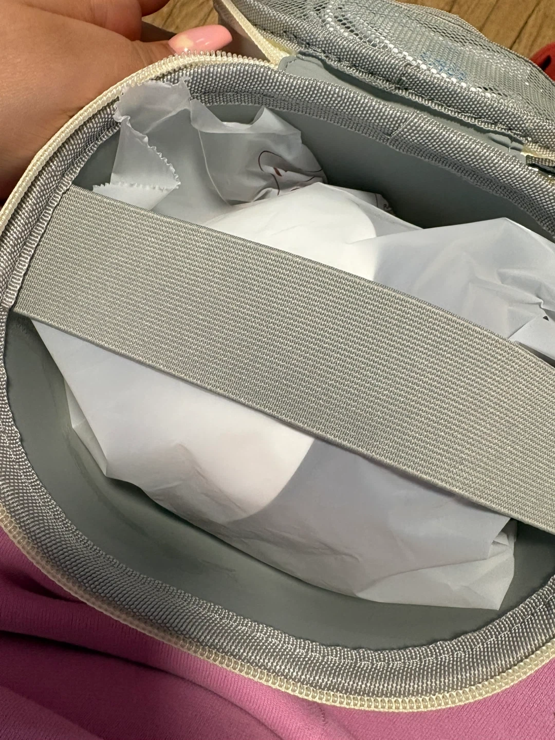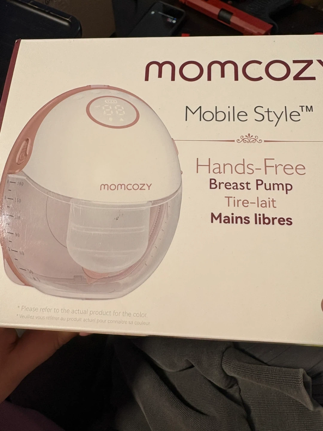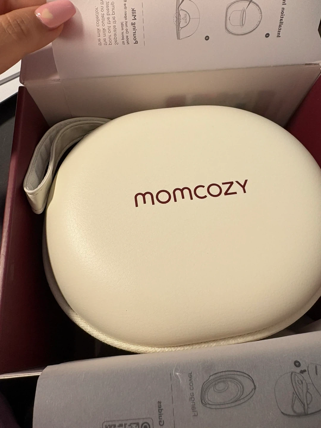 Momcozy wearable electric breast pump in mobile style. It includes the main pump, a user guide, and an extended warranty card. This pump is designed for discreet and convenient use.