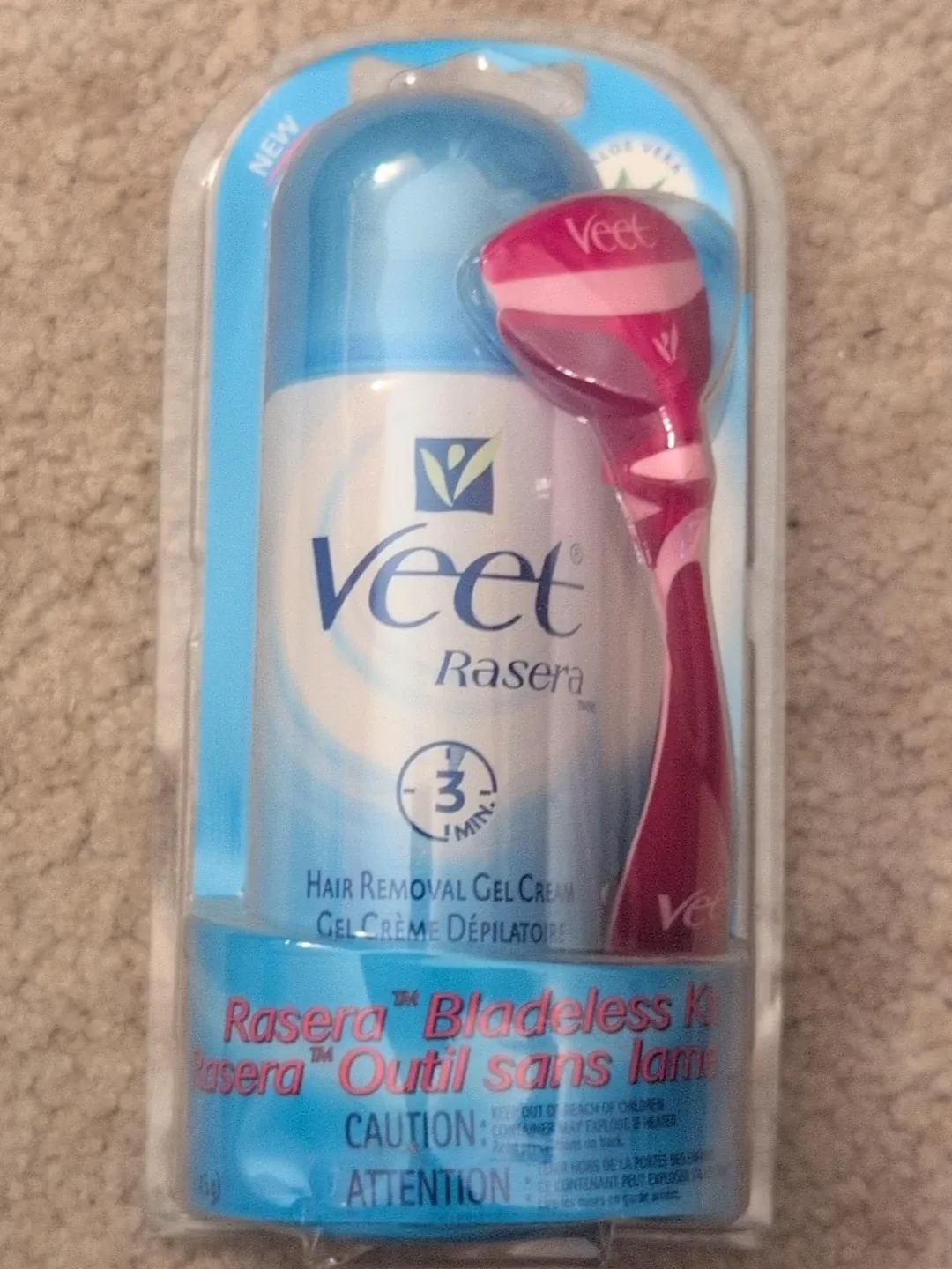 Veet Rasera hair removal gel cream with a bladeless tool. Works in 3 minutes. Includes Aloe Vera. Keep out of reach of children.