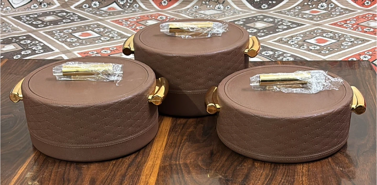 β’ Rich brown quilted exterior with gold colour finished handles & lid knobs