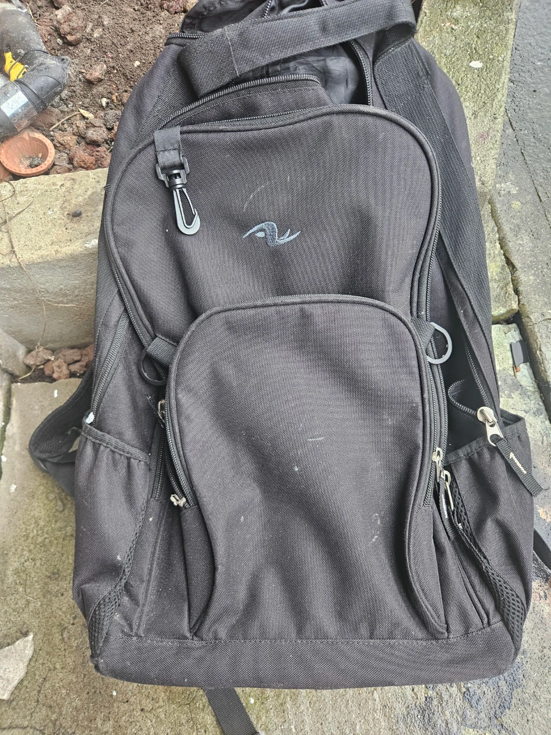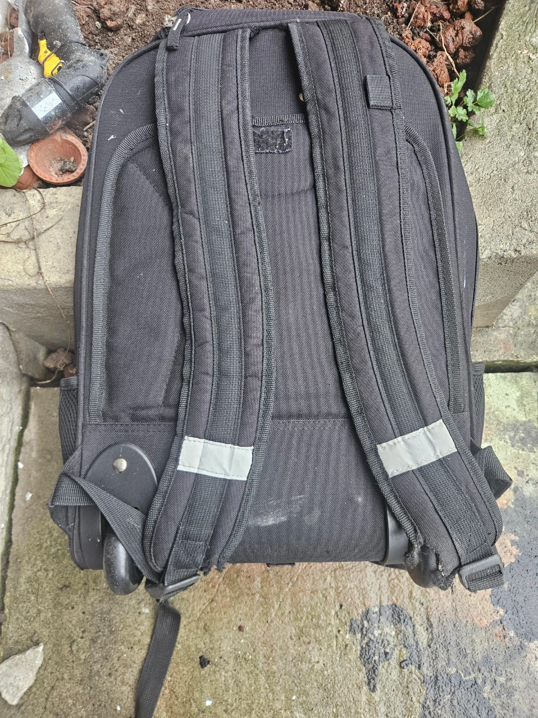 This black rolling backpack offers a convenient way to carry your essentials. It's made of durable fabric and features adjustable shoulder straps. Wheels are included for easy transport.