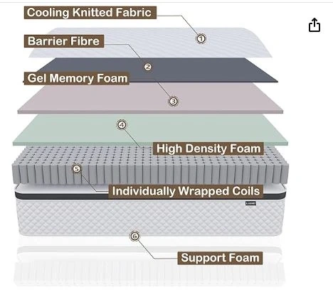 Selling a DEEGARI Gel Memory Foam Hybrid Mattress in Queen size! This mattress features a cooling knitted fabric, barrier fibre, gel memory foam, high-density foam, individually wrapped coils, and support foam. It measures 14 inches in height, 80 inches in length, and 60 inches in width. It's designed for pressure relief and pleasure embrace